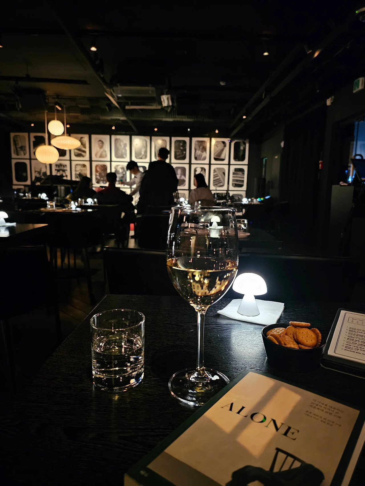 와인을 즐겨 마시는 나는 와인을 글라스로 시킬지 바틀로 시킬지 한 세월 고민을 하다가, 바틀을 시키면 영락없이 발이 묶일 것 같아 쇼비뇽블랑 한 잔을 시켰다.