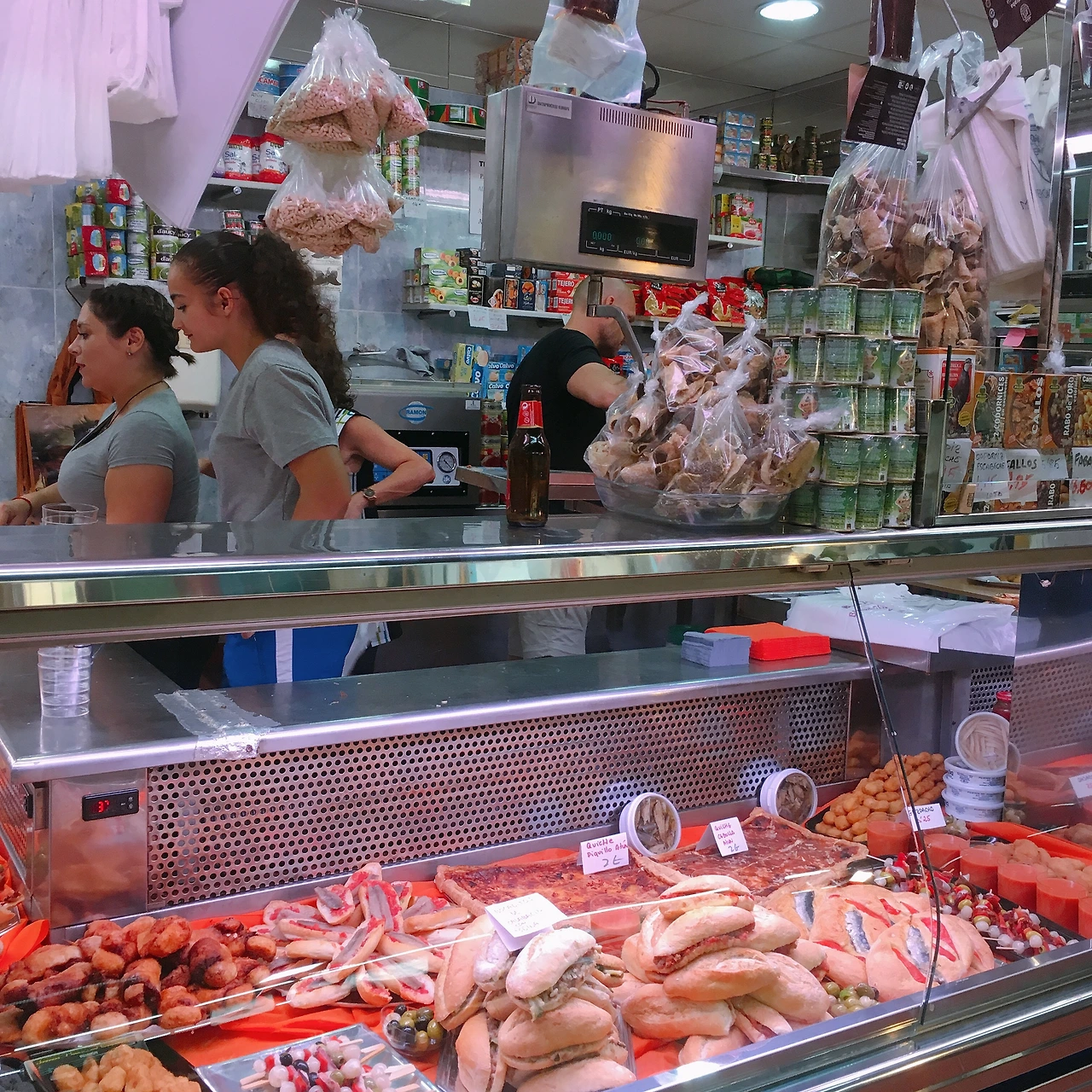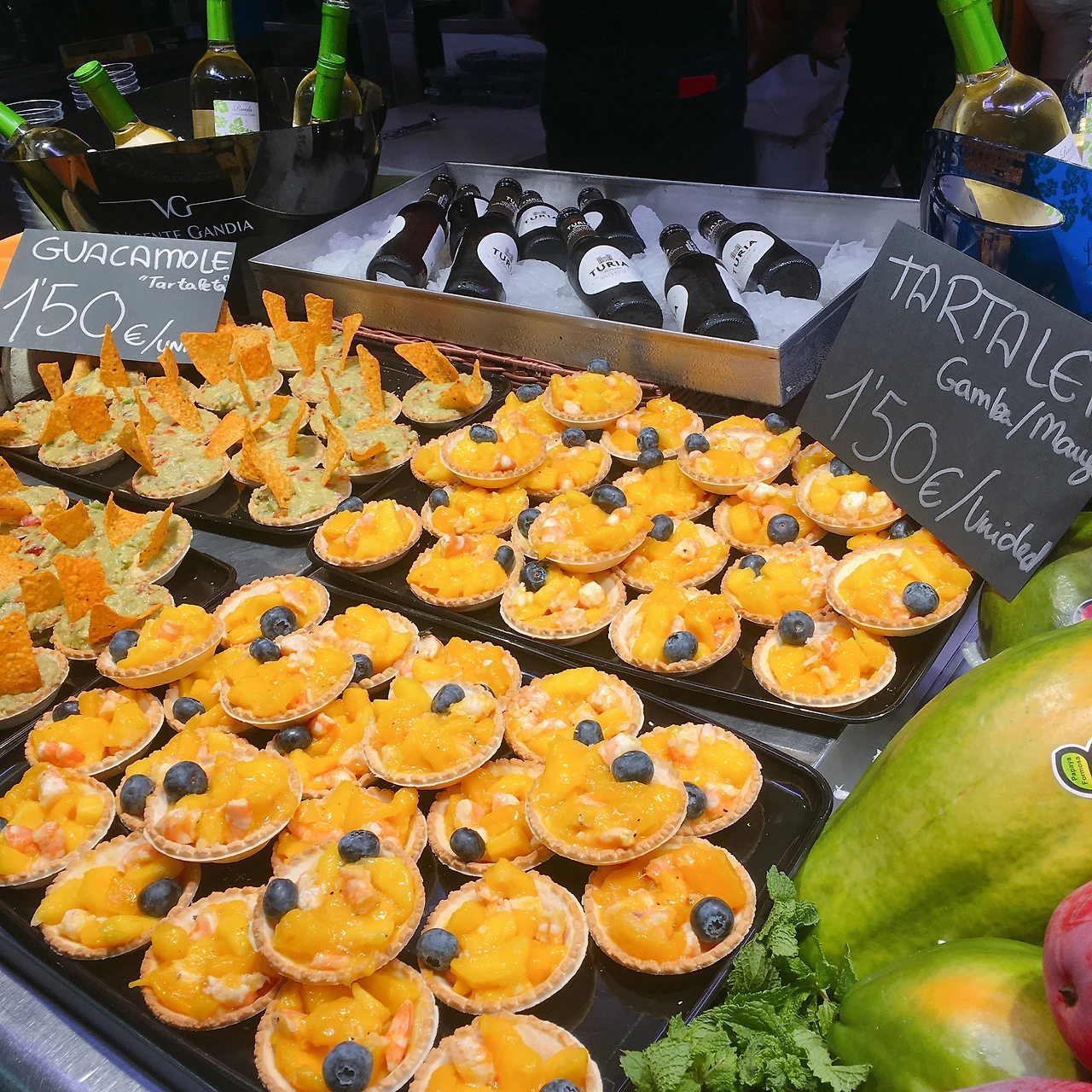아무튼 이 날은 시장의 가게들이 타파스 바로 변신한다. 정육점은 작은 햄버거나 쵸리조, 하몽을, 야채 가게에서는 다양한 핀초를, 과일 가게에서는 과일이 듬뿍 올려진 타르트를 판다. 물론 음료도 파는데 이 음료 가격이 무척이나 착하다. 1-2유로에 살 수 있는 맥주를 먼저 하나 시켜 손에 들고 두리번거리며 뭐를 시켜 먹을지 돌아다녔다