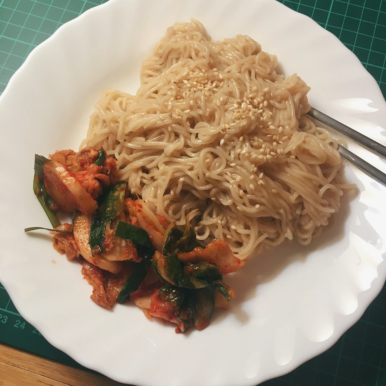 딱히 입맛도 없고 요리도 귀찮을 때는 간장 참기름 국수를 만들어 먹는다. 만약 집에 김치가 남아 있다면..... 최고다