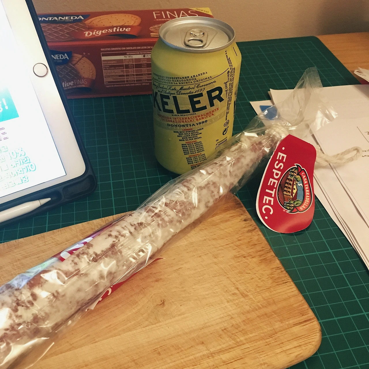 푸엣(Fuet)은 돼지고기로 만든 햄 종류인데 건조된 햄이므로 이대로 썰어서 먹으면 된다. 하몽, 쵸리죠에 비해 한국에는 별로 알려져 있지 않지만 짠맛도 덜하고 조금 더 고소한 느낌이라 한 번씩 사 먹는다. 이 날은 점심을 너무 많이 먹어서 저녁은 푸엣을 곁들여 맥주 한 캔 마시는 것으로 마무리했다