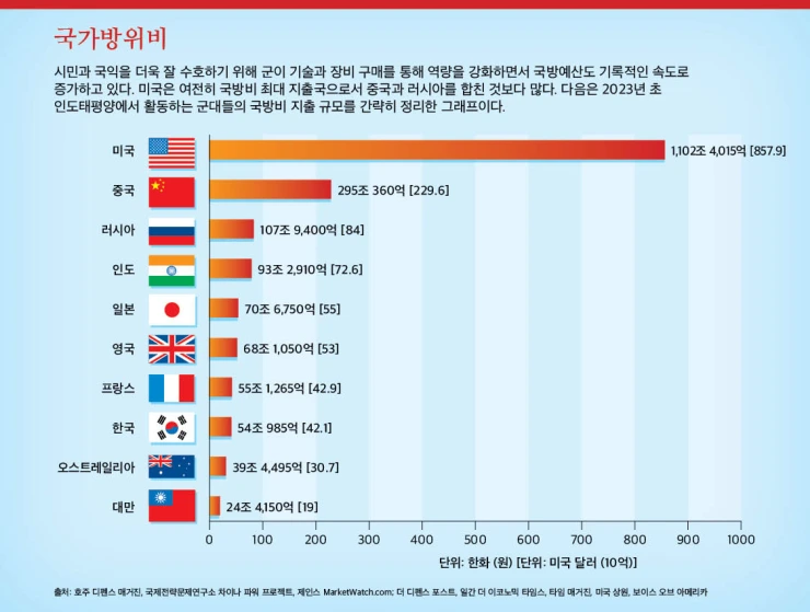 약육강식의 세상에서 말했듯, 현재 딱히 적수가 없는 데도 미국이 국방비로만 1,000조를 쏟아 넣고 있는 이유가 무엇인지 생각해 봤으면 좋겠다.