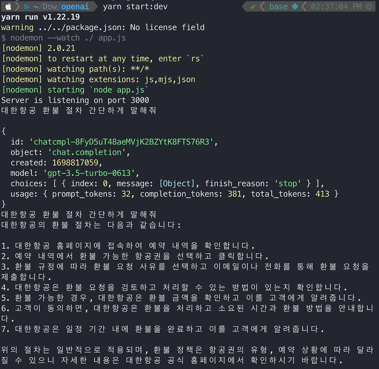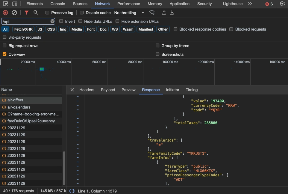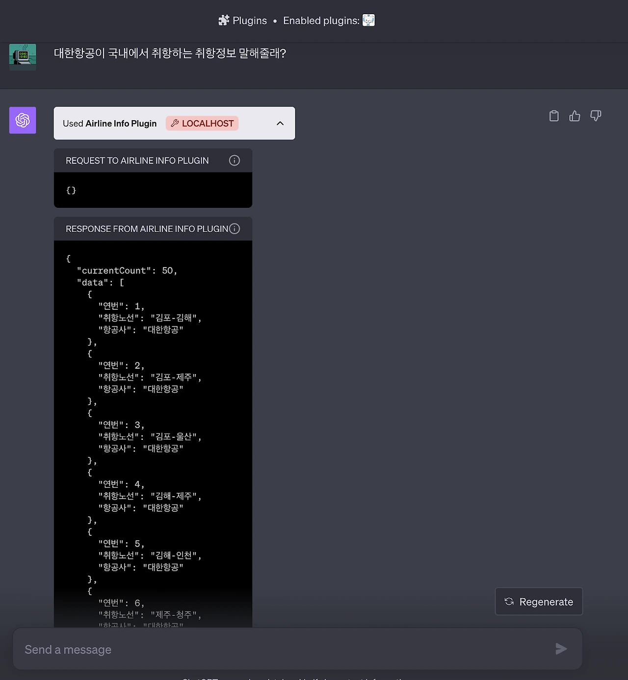CASE 2 (Plugins 방식)에서의 예시는 API 응답 데이터에 대해 GEN AI에게 설명하고 이에 대한 GEN AI의 해석과 결과에 대해서 말해주고 있다. 마찬가지로 동 방식으로 당사 홈페이지에서 호출하고 있는 API의 스펙에 대한 정의/설명 등을 통해 GEN AI에게 이를 사용할 수 있게 해 줄수는 있다. 대한항공에서 사용중인 API(air-offers)에 대한 실제 화면과 API 응답값은 [그림 1, 2] 참고