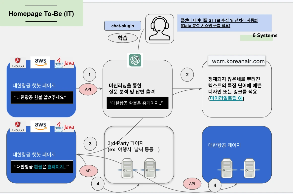 ex2) 고민한 To-Be 구상으로 STT를 통해 LLM 모델에 fine-tuning을 거쳐 자동학습을 하여 LLM 모델을 지속 발전시키고 답변에 마찬가지로 특정 발화에 링크 처리를 하여 고객에게 안내 할 수 있도록 조치하는 시스템 플로우이다. fine-tuning 기능은 해당 작업 범위 내 포함되어 있지 않고, 보다 큰 지원이 필요한 영역이기 때문에 추후 지원을 받게되면 개발 예정이다. [그림 4] 참고