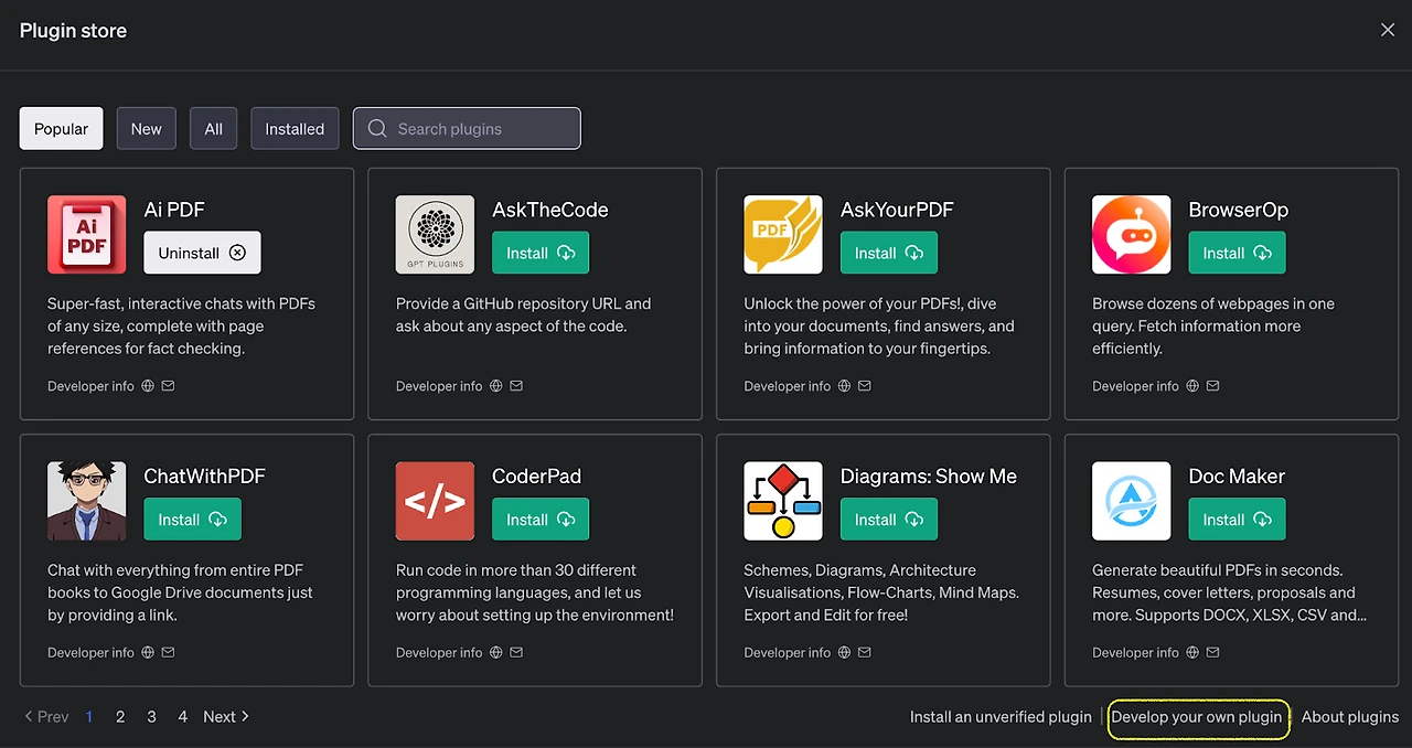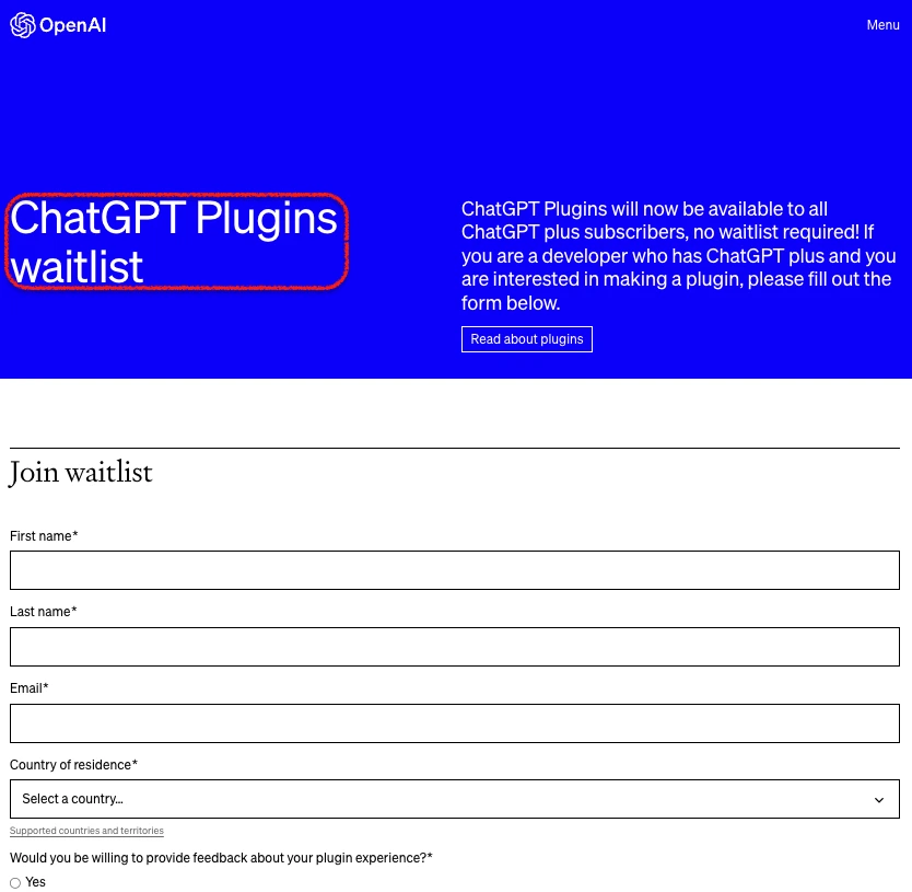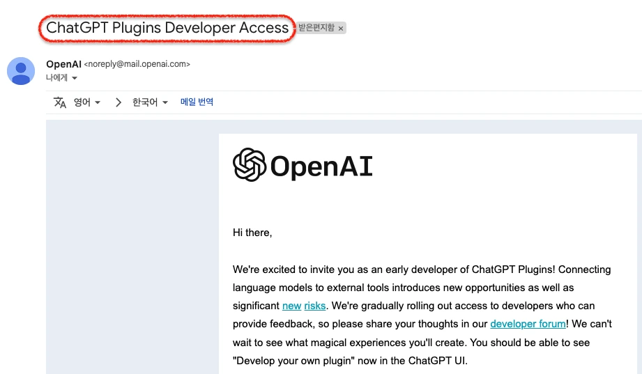 ChatGPT Plugins은 ChatGPT 내에서 학습 기간의 제약이나 잘못된 데이터를 불러오는것을 보완하기 위해 만든 기능으로 허가된 개발자만 접근이 가능하다. 해당 기능 개발을 위해 openai 측으로 특정 양식을 작성하여 플러그인 개발자 신청을 하였고, 이후 심사를 거쳐 OpenAI로 부터 플러그인 개발자 허가를 받았다. [그림 4, 5] 참고