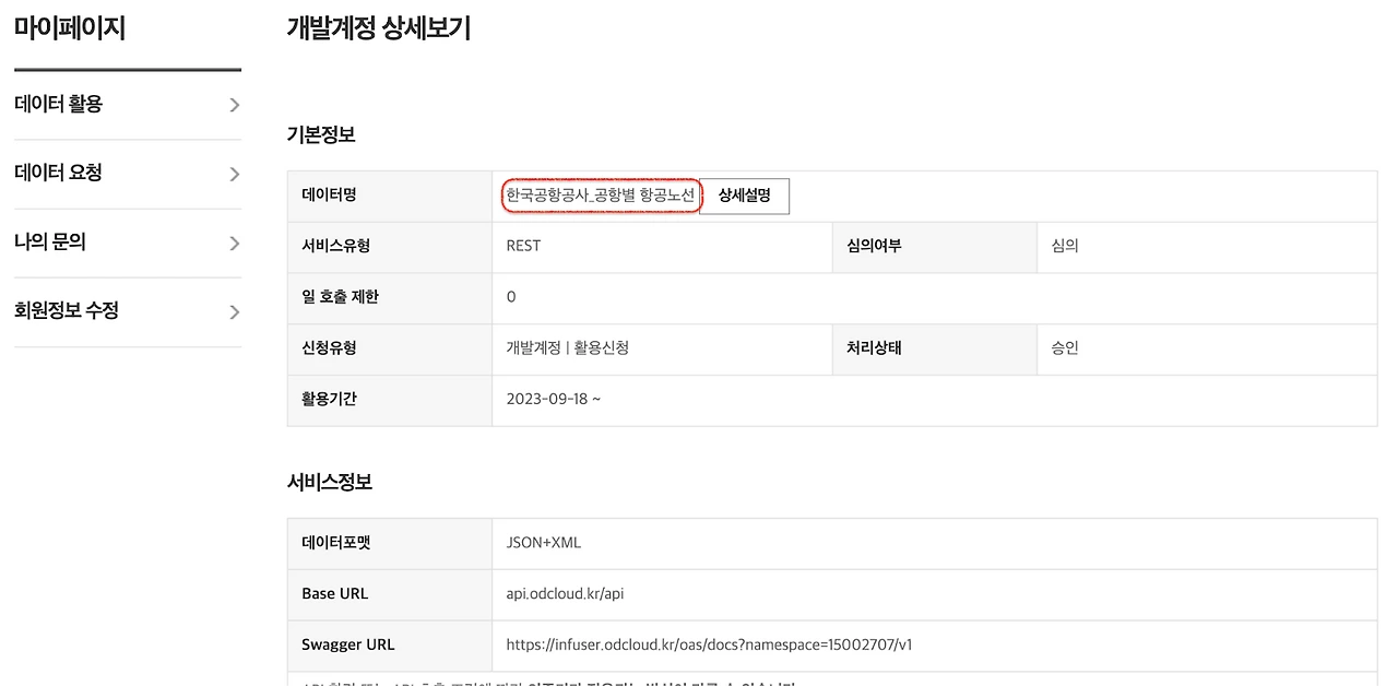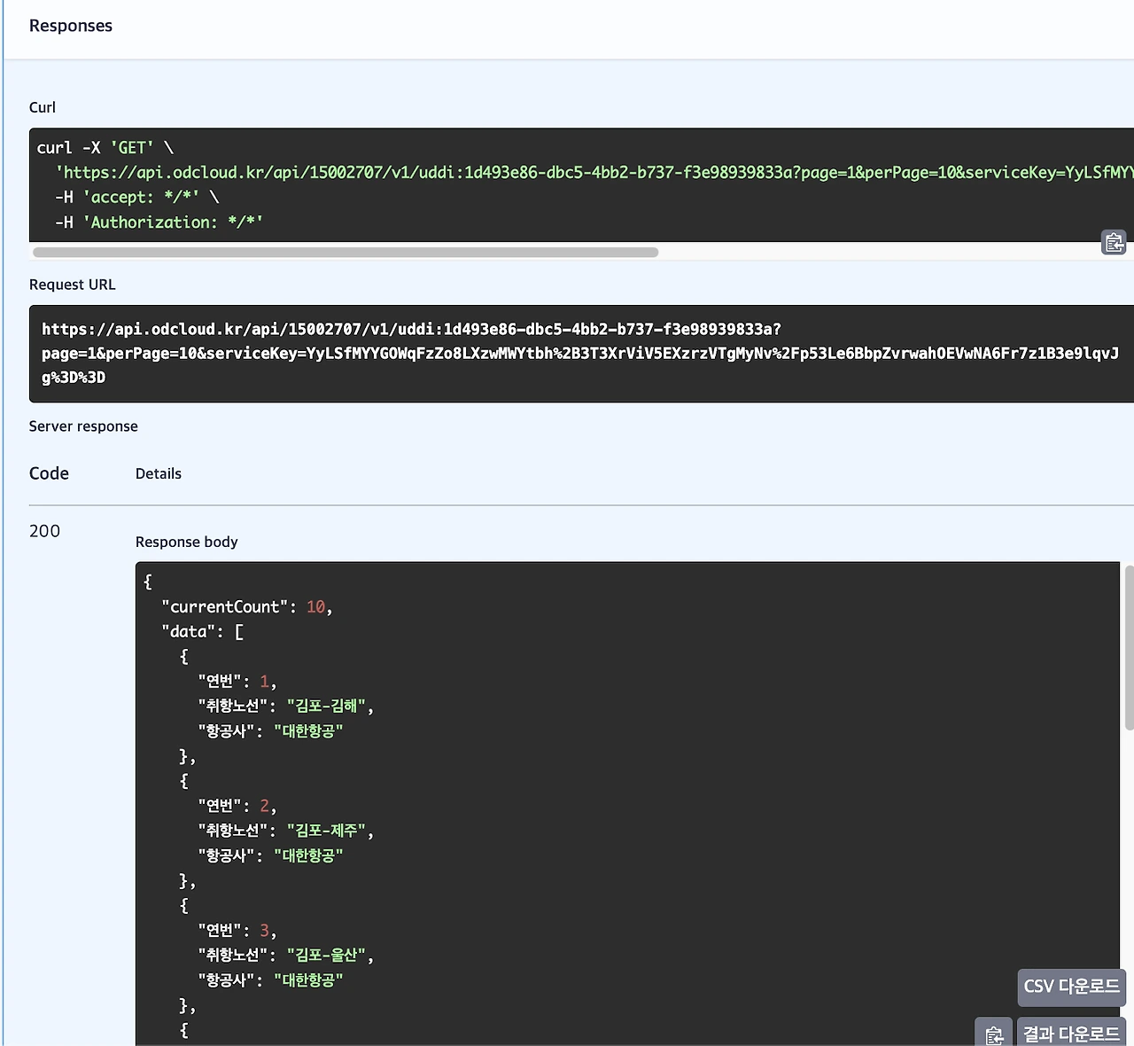항공 데이터의 활용을 검토하기 위해 공공데이터 포털에서 한국공항공사_공항별 항공노선과 관련된 REST API를 신청하였다. 해당 데이터는 허가 후 개인 API 인증 KEY가 있어야만 조회 가능하며, JSON 형태로 RESPONSE 된다. [그림 6, 7] 참고