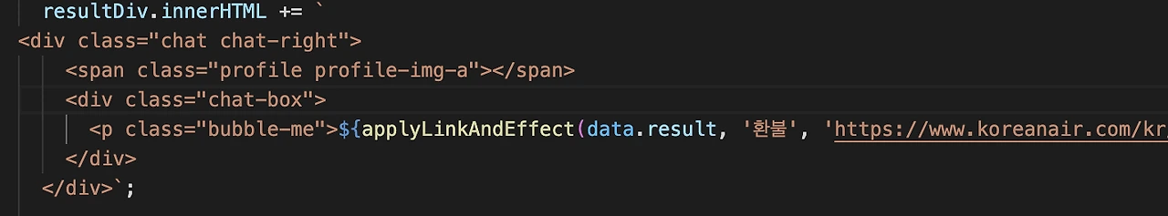 프론트엔트 영역에서 활용가능한 방식으로, 입력되는 DATA의 활용이 아닌 결과 값으로 Response 되는 Data의 값을 활용하는 방식. 응답되는 답변에 특정 단어가 들어가는 경우 관련 링크로 바로 이동해 줄 수 있는 기능을 넣어 활용가능 하다