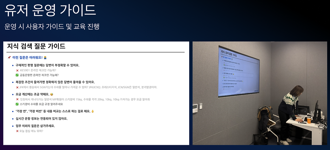 초기에는 한정된 도메인(FAQ, 내부 규정 등)에서만 운영했지만, 반복 검증을 통해 점차 복잡한 영역으로 확장했다. 작은 성공이 쌓이자, 자연스럽게 표준화된 문서 작성 규칙과 데이터 정제 프로세스가 조직 내에 자리 잡았다. 결국 이 프로젝트는 기술을 도입한 것이 아니라, 사람이 AI와 협력하는 방식을 설계한 일이었다.