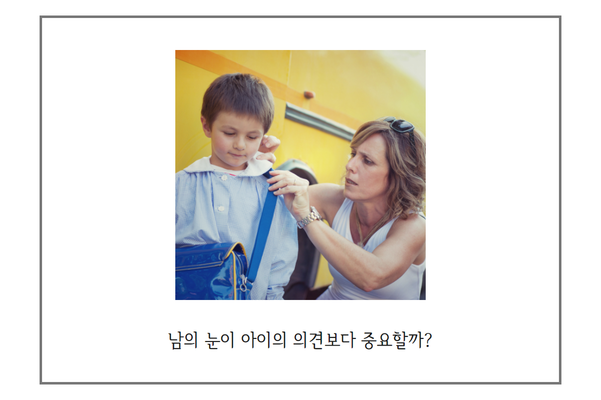 남들이 어떻게 볼 것인가. 사실 그건 그리 중요한 것이 아니다. 우리는 너무 많이 남의눈을 의식하며 산다. 의식하지 않으려 해도 서로가 서로에게 관심이 많은 문화 속에 살다 보니 자연스럽게 의식이 되기도 한다. 하지만 그것보다는 아이의 의견이 더 중요하지 않은가?