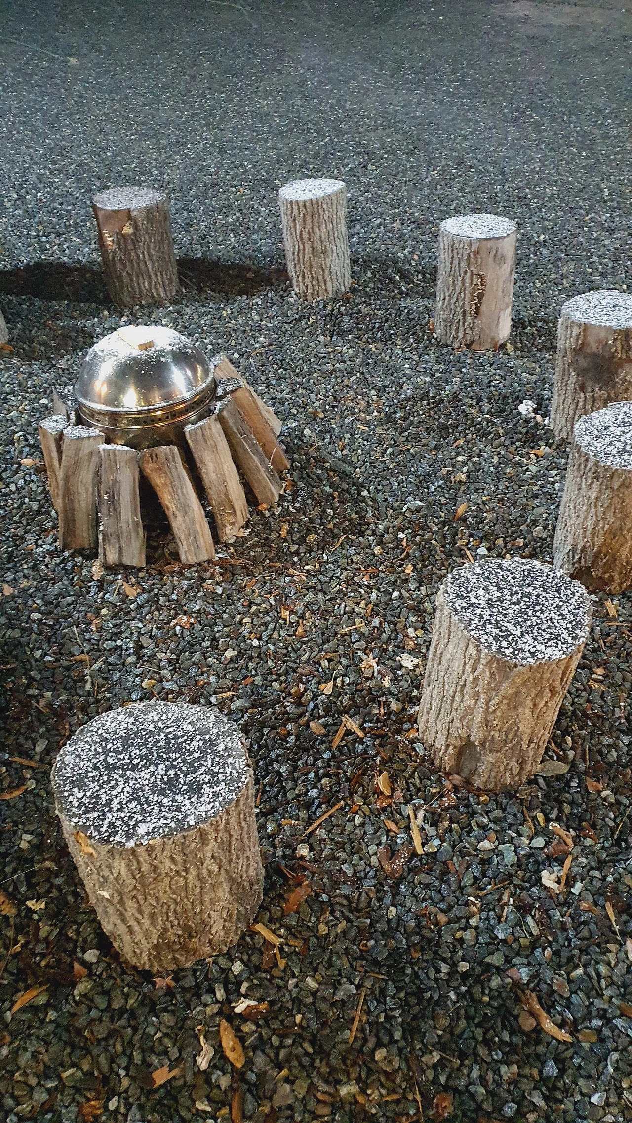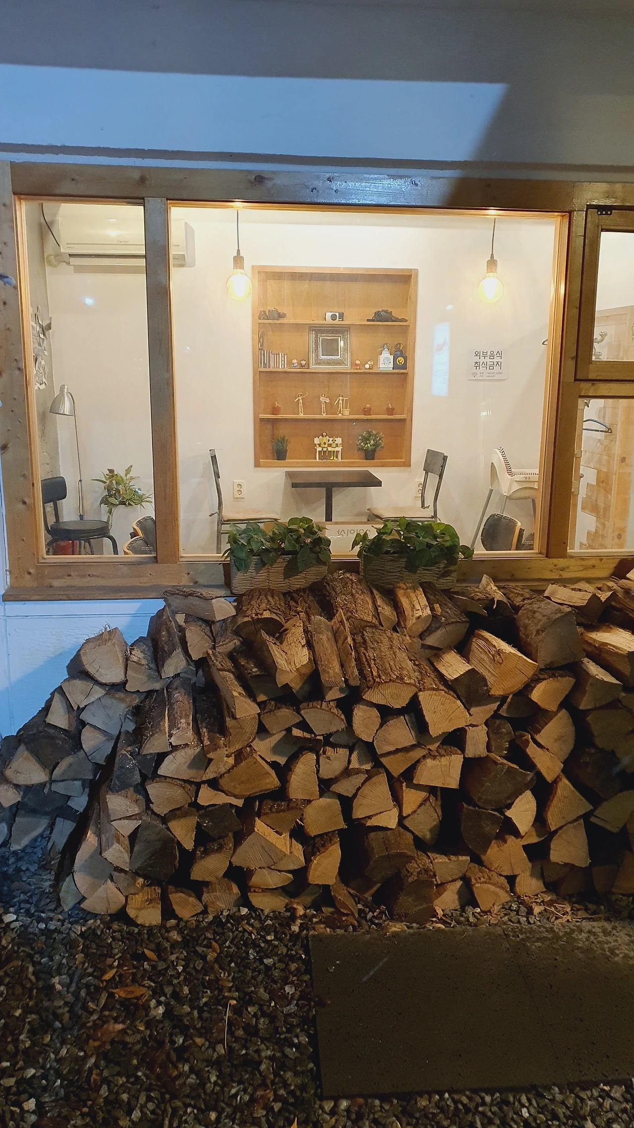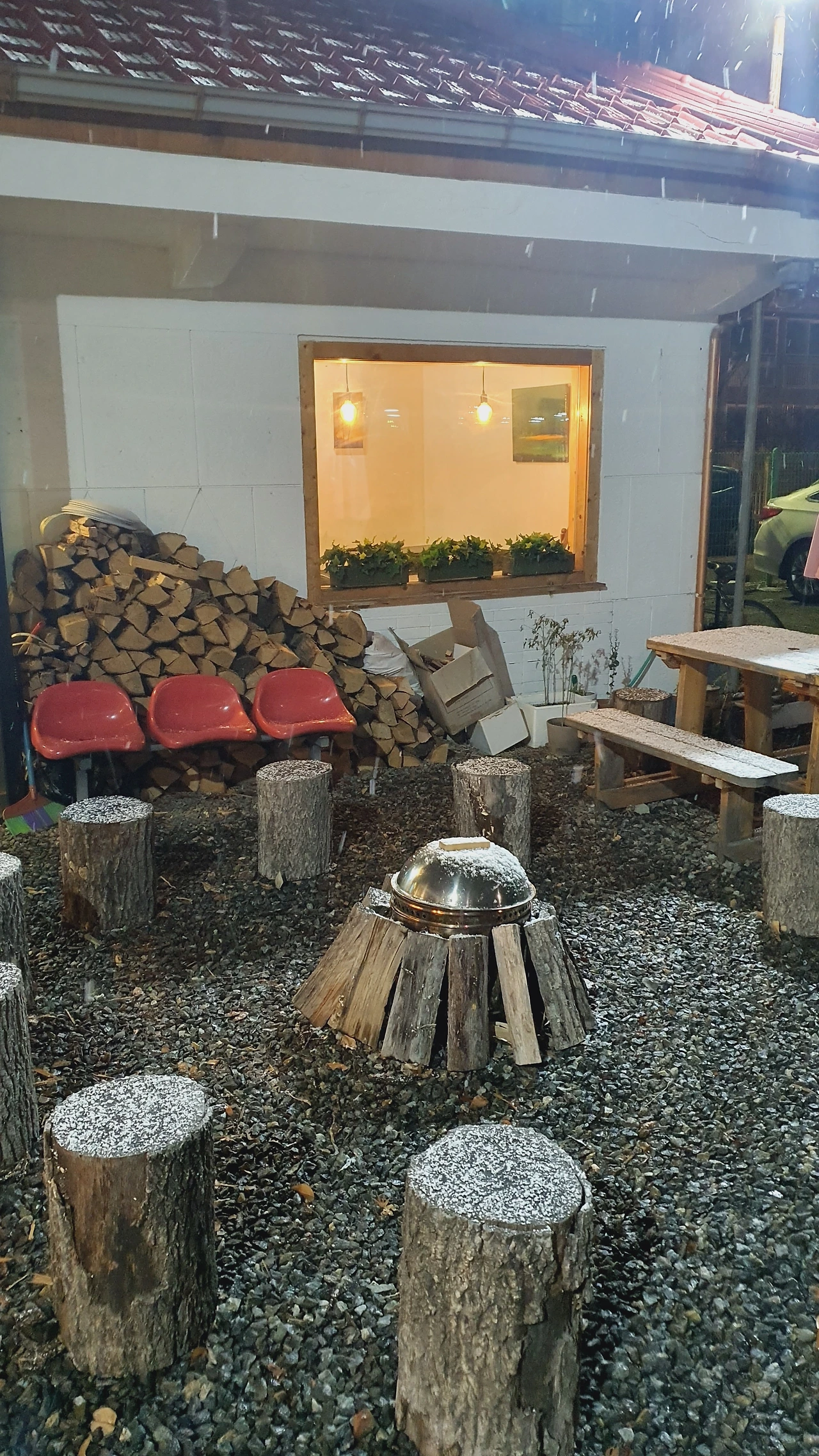 창밖을 바라보며 라테 한 모금 마시고, 다시 책으로 눈을 돌리며 그렇게 한 권을 다 읽고 나니 날이 어둑어둑해졌다. 밖으로 나가니 통나무 의자에 눈이 얇게 내려앉아있었다. 카페 앞마당에는 캠프파이어를 할 수 있게 만든 공간이 있었는데 이곳에서 고구마를 구워, 호호 불며 먹으면 더없이 행복할 듯하다.