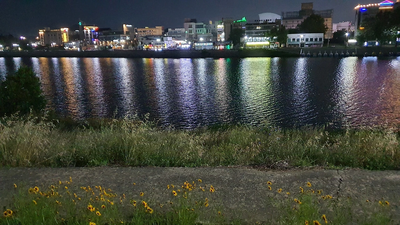 조금 내려왔을 뿐인데도 강 폭이 확 넓어졌다. 산책하는 사람들도 확 늘었다. 넓은 강물 위로 건너편 유원지의 불빛이 어른거린다. 오래된 간판이며 낡은 건물들은 불빛 속으로 사그라져 보이지 않는다. 색색의 조명만이 낭랑하게 빛난다.