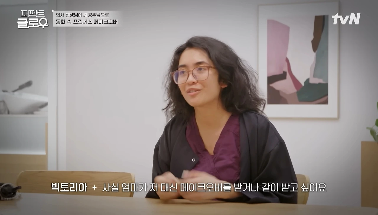 K뷰티 전문가들의 뉴욕 정복기, 퍼펙트 글로우 9화. 신경외과 레지던트로 주 80시간을 일하느라 꾸밀 시간이 없는 빅토리아를 위해 어머니가 신청한 시간이었다. 피로에 잠식되어 있던 딸은 디즈니 공주처럼 발랄해졌다.
