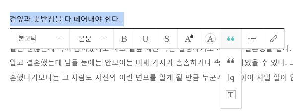 내 문장을 드래그해서 선택하면 아래처럼 서식을 넣을 수 있다. "글상자가 아무리 찾아도 안 보여요"라고 질문해 주신 작가님이 계셔서 글 상자 만드는 부분을 표시했다. 오른쪽은 모바일에서 글 쓸 때이다. 양쪽정렬만 제외하고 모든 기능을 적용할 수 있다.