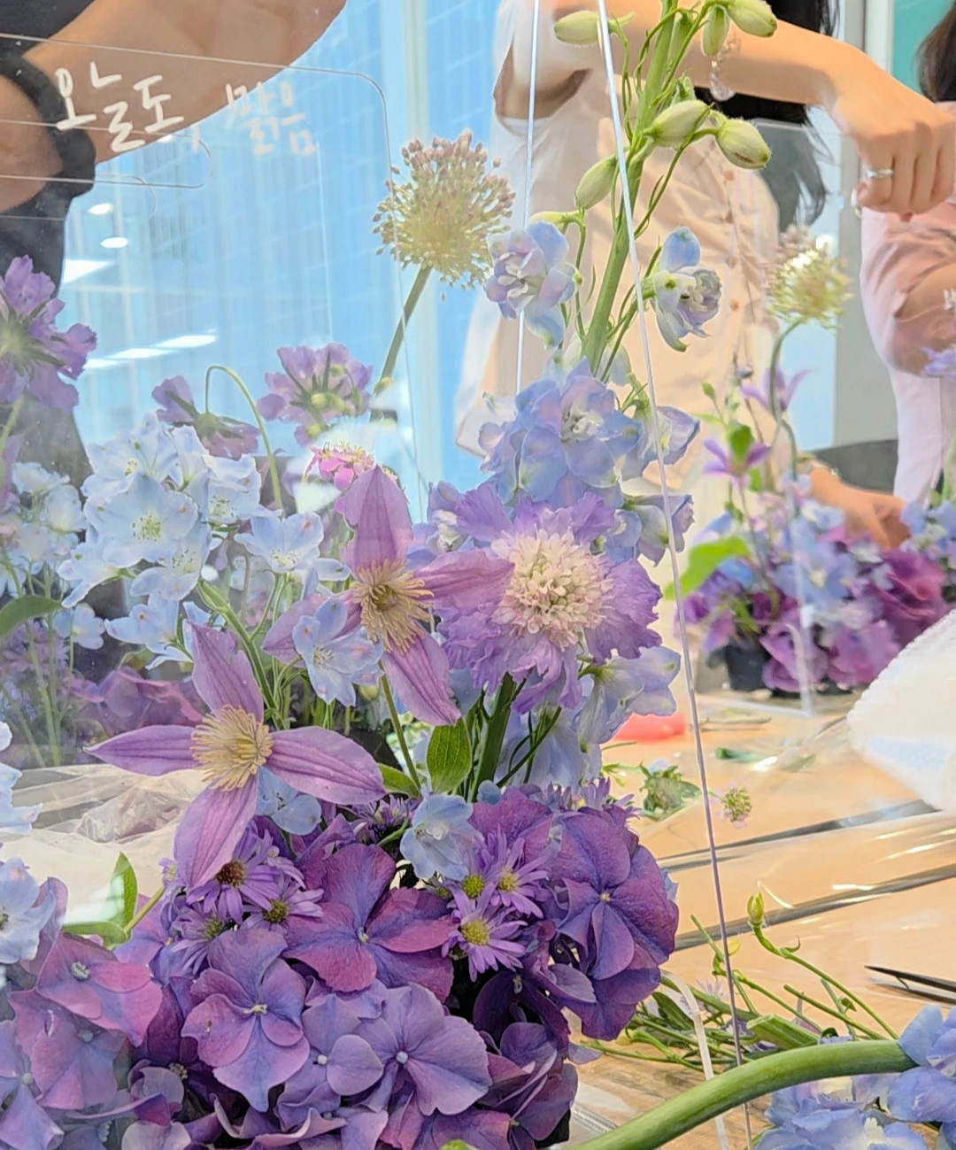 드디어 전날, 꽃시장에 간다. 한 바퀴 돌아보니 역시 블루보라톤으로 만들만한 꽃이 괜찮다. 풍성하게 채울 수국이 1순위. 수국만으로 메우면 꽃이 둥둥 떠보이니 사이사이에 공작초가 있어야 한다.