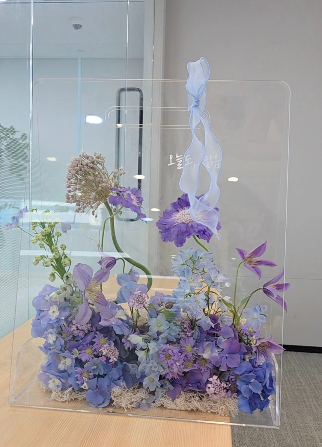 수업 일주일 전부터 준비에 돌입한다. 아크릴백에 붙일 스티커 문구를 요청해서 주문하고, 대형 아크릴백은 파는 곳이 많지 않으니 품절되기 전에 사다 둔다. 리본은 대한항공 스튜어디스와 흡사한 색상과 모양으로. 수업할 때 리본 선택 이유를 풀어놓으면 좋아하시겠지? 플로랄폼 같은 부자재들도 미리 준비해 둬야 만약의 사태가 일어나지 않는다.