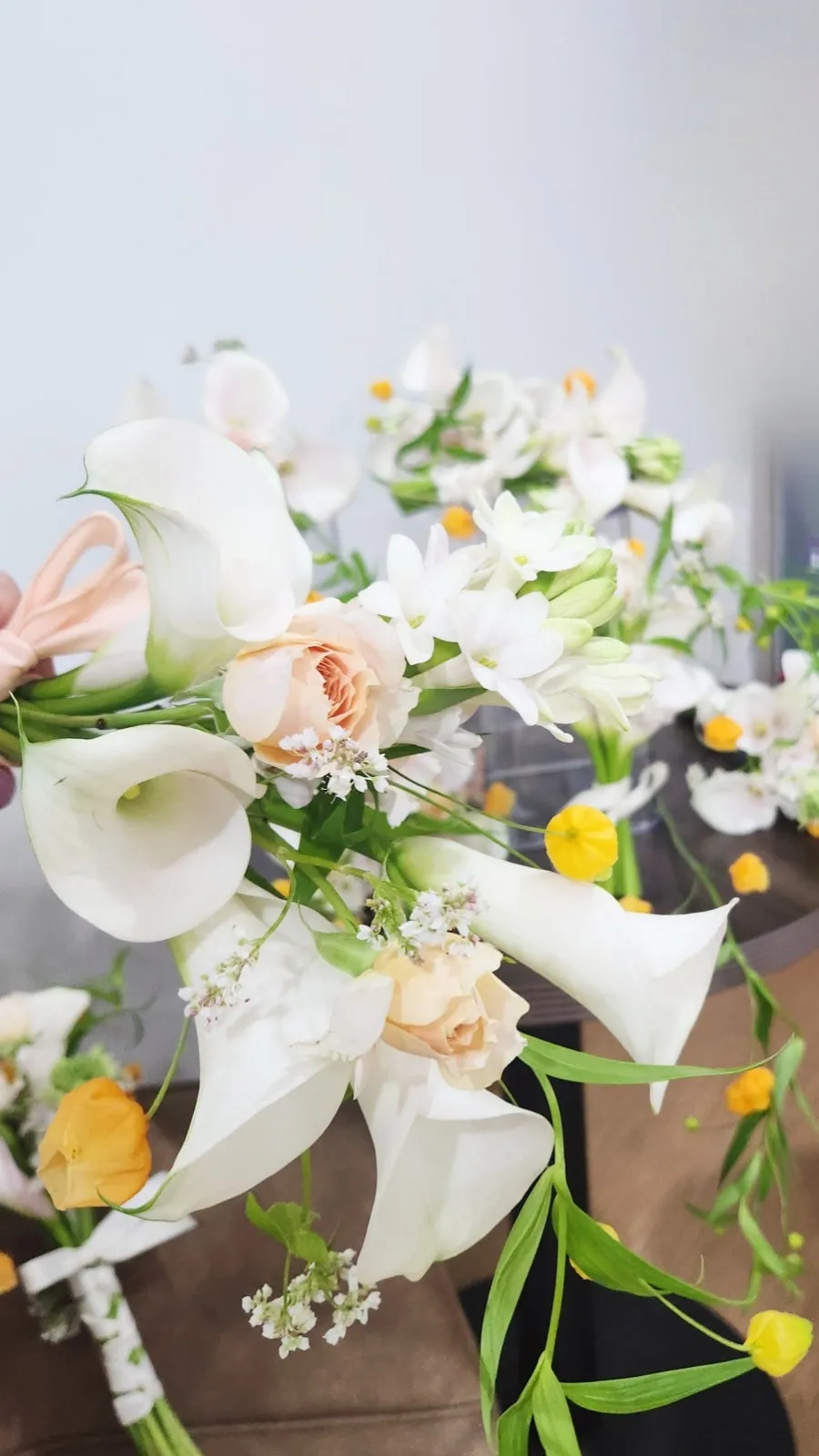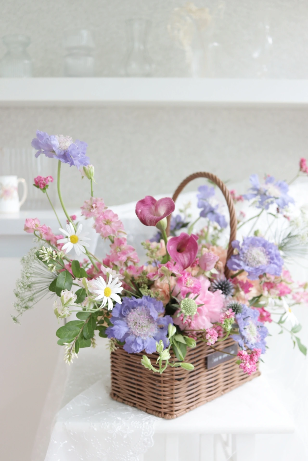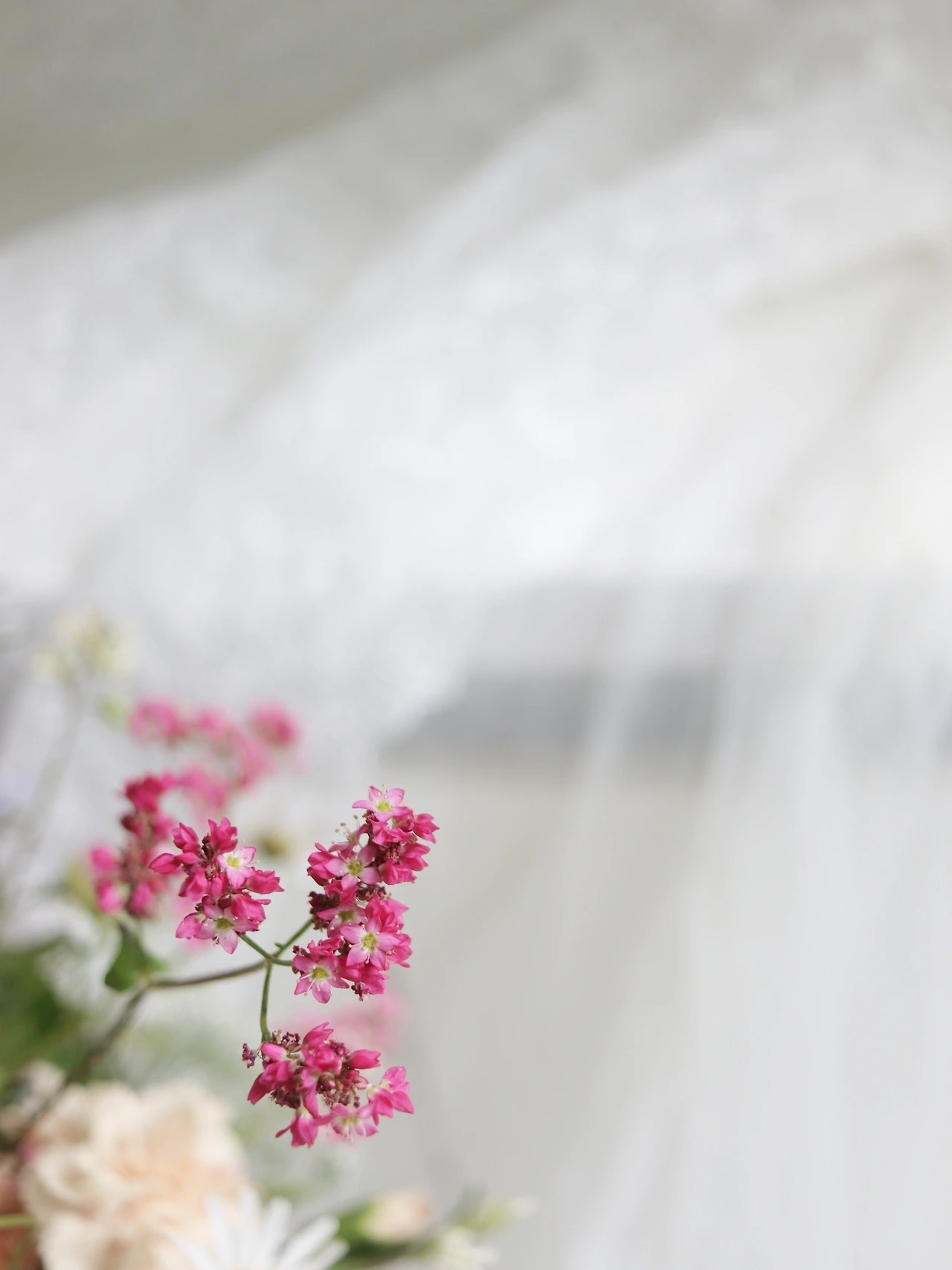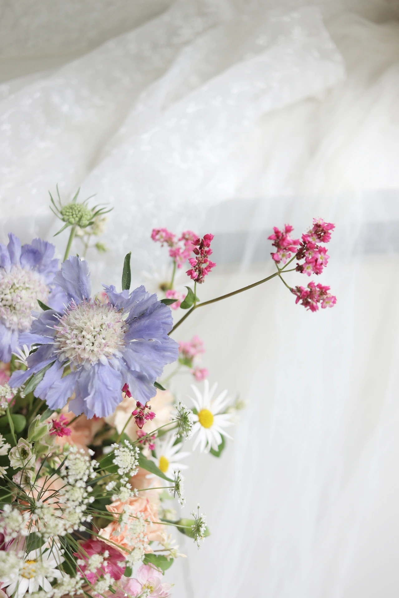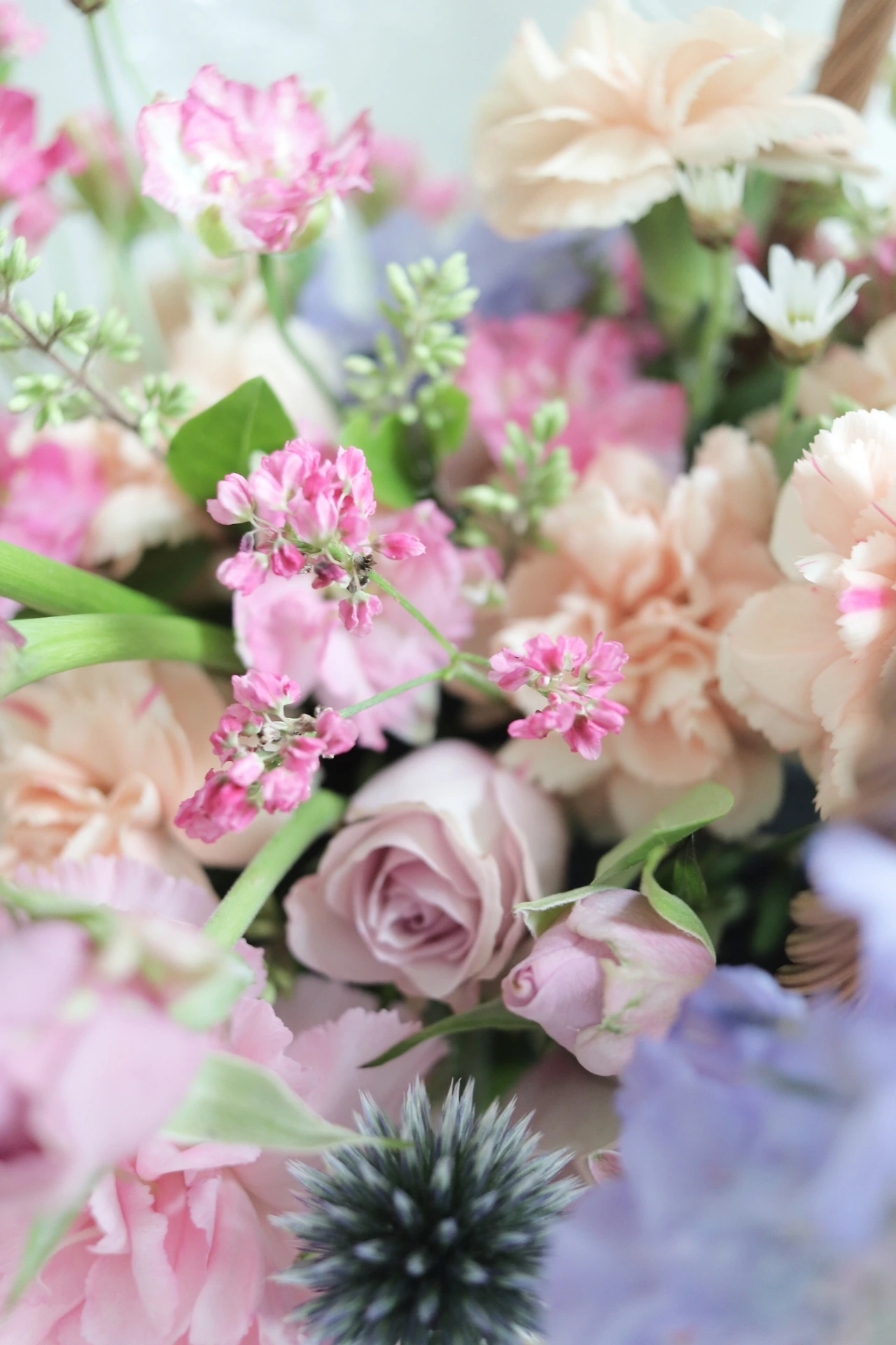수업때마다 나는, 조그마한 존재가 얼마나 커다란 변화를 만들 수 있는지 눈으로 보여준다. 큰 꽃만 사도 재료비는 빠듯하지만, 언젠가 자신이 보잘 것 없이 느껴질 때 이 말을 떠올리며 위로받기를 바라기 때문이다. 눈에 확 띄는 꽃들이 시선을 끌어온다면, 존재감 없는 꽃은 시선을 붙잡는다. 작품이 완전히 달라지게 한다. 마치 요리할 때 소금처럼. 셰프의 시크릿 재료 1g 처럼, 작은 꽃의 큰 비중을 찾아주는 희열을 누리며 부케 수업을 했다. 하얗기만 하지 않고 진분홍도 섞여있기에 상큼하다.