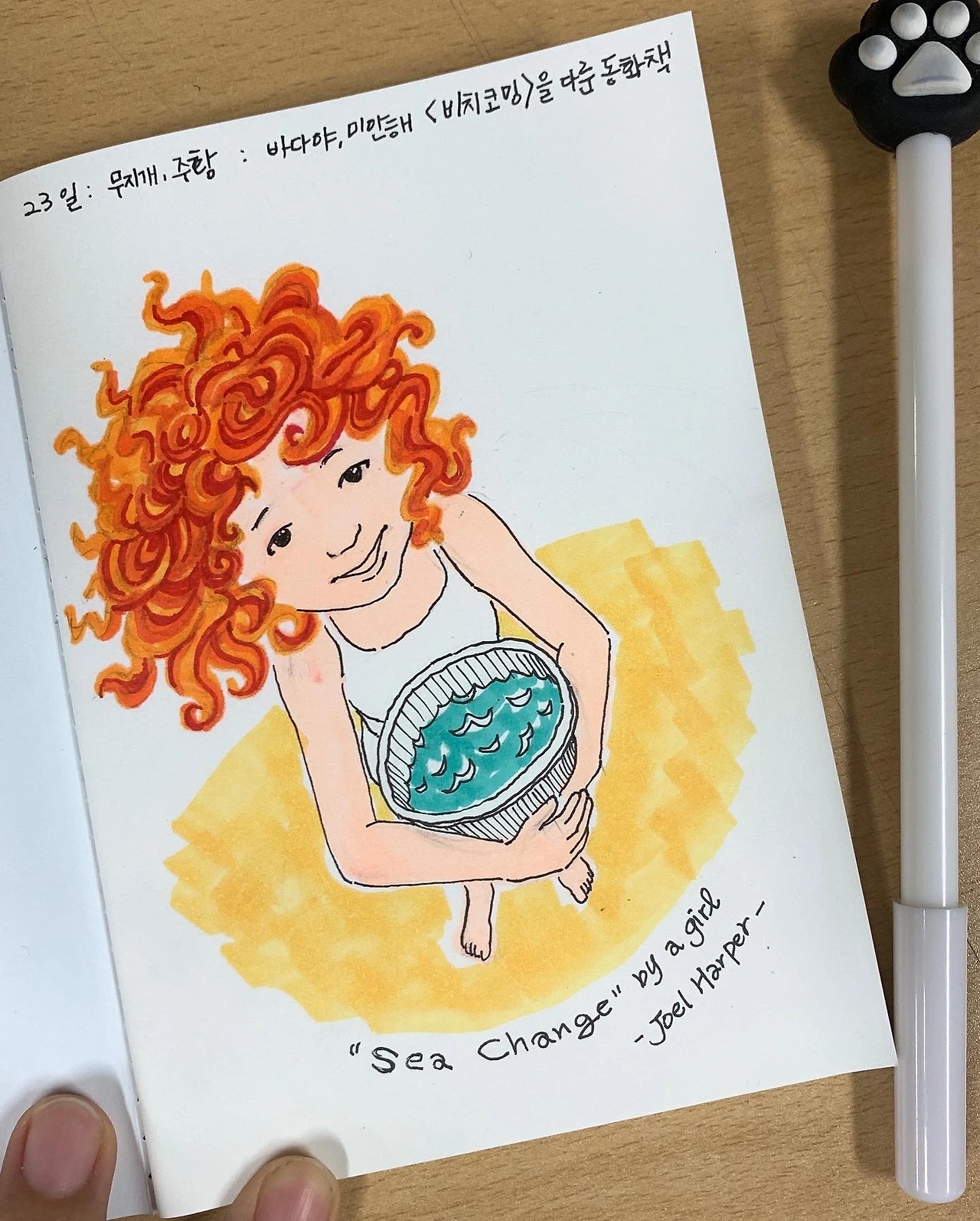 문장이 하나도 없는, 그림으로만 이루어진 그림책, <바다야 미안해>에 나오는 소녀의 불꽃같은 머리칼이 오늘의 그림 주제, 주홍의 주인공이다.