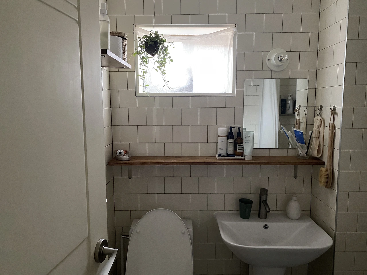 원목 선반 역시 화장실에 나무가 웬 말이냐는 소리를 귀에 딱지가 않도록 들었지만 그러고도 참죽나무를 화장실에 맞게 재단해 와 오일스테인과 바니쉬로 마감해서 그럴듯한 선반으로 만들었다. 사장님들한테는 말 안 듣는 내가 눈엣가시였겠지만 그렇다고 내가 믿는 구석 하나 없이 생떼를 부린 건 아니었다. 우리집 욕실에 자그마하게 나있는 창문이 바로 그 믿는 구석. 그 책받침 만한 구멍으로 빛과 바람이 드나들어 주기를, 축축한 화장실을 바삭하게 말려주기를 간절히 바랐다.