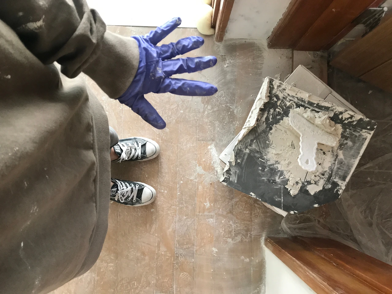 핸디코트 작업을 아무리 잘했다고 해도 사람이 하는 일인지라 미세한 요철이 있을 수 있기 때문에 전체적으로 사포질을 한 번 해주어야 한다. 그라인더를 사용하면 작업이 한결 편해졌겠지만 우리에게 그라인더가 있을 리 없다. 이번 한 번을 위해 그라인더를 구매하기에는 돈이 아깝고, 산다고 하더라도 우리가 효과적으로 사용할 수 있을지도 미지수였다. 그러면 방법은 하나뿐. 다들 아는 그 사포를 뭉터기로 사서 벽을 무지막지하게 문질렀다. 몸에 뚫려 있는 구멍이란 구멍에 석고 가루가 쌓이며, 머리부터 발끝까지 허연 가루를 뒤집어써서 눈사람처럼 웃긴 몰골이 된다. 서로를 가리키며 정신 나간 사람들처럼 킥킥거린다.