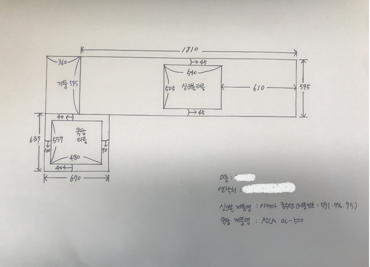 집이 제주라서 파손 우려도 있고 직접 잰 치수가 혹시라도 맞지 않을까 봐 걱정되는 부분이 많았지만 별다른 방법이 없었다. 상판이 들어갈 부엌 공간의 사이즈와 싱크볼이 설치될 부분의 타공 사이즈를 몇 번이고 줄자로 재확인한 후에야 겨우 주문을 완료했다. 따로 제작할 상하부장과 잘 맞지 않아 돈만 날리게 되는 끔찍한 불상사가 일어나지 않도록 시뮬레이션에도 심혈을 기울였다.