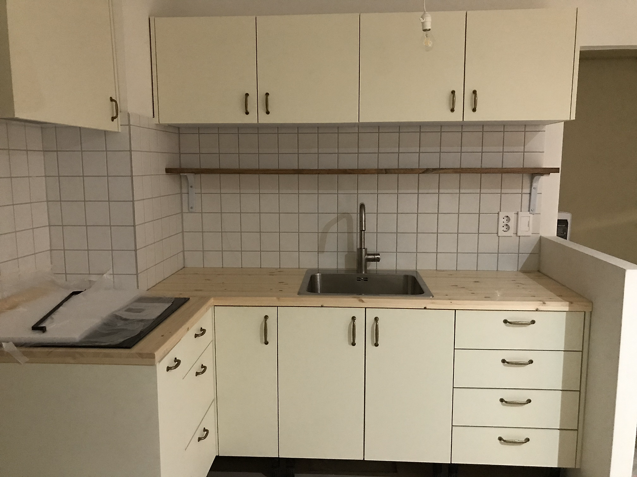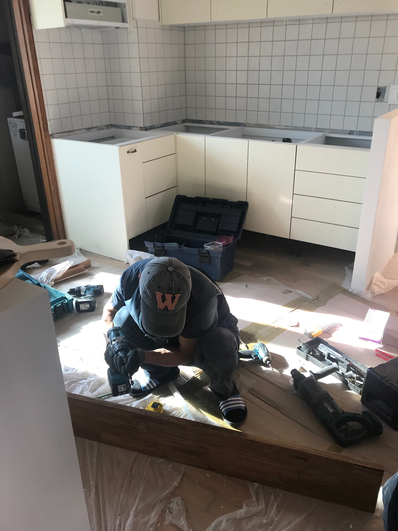 사장님은 우리 둘만큼이나 자주 현장을 찾았다. 그는 공간에 맞게 MDF를 컷팅하여 상하부장을 만들어 주었으며, 온라인에서 주문한 원목 상판과 선반 설치까지 도와주었다. 하다가 일이 잘 안 풀릴 때에는 나지막하게 구시렁거리는 소리가 들리기도 했지만, 내 눈에는 오랜만에 하게 된 까다로운 작업을 꽤나 즐기고 있는 사람처럼 보였다. 매일을 똑같고 반복적인 일만 하던 사장님께 우리의 자그마한 부엌 작업이 즐겁고 뿌듯한 기억으로 남았길 바라본다. 그를 만나지 못했다면 우리의 부엌은 결코 완성되지 못했을 것이다.