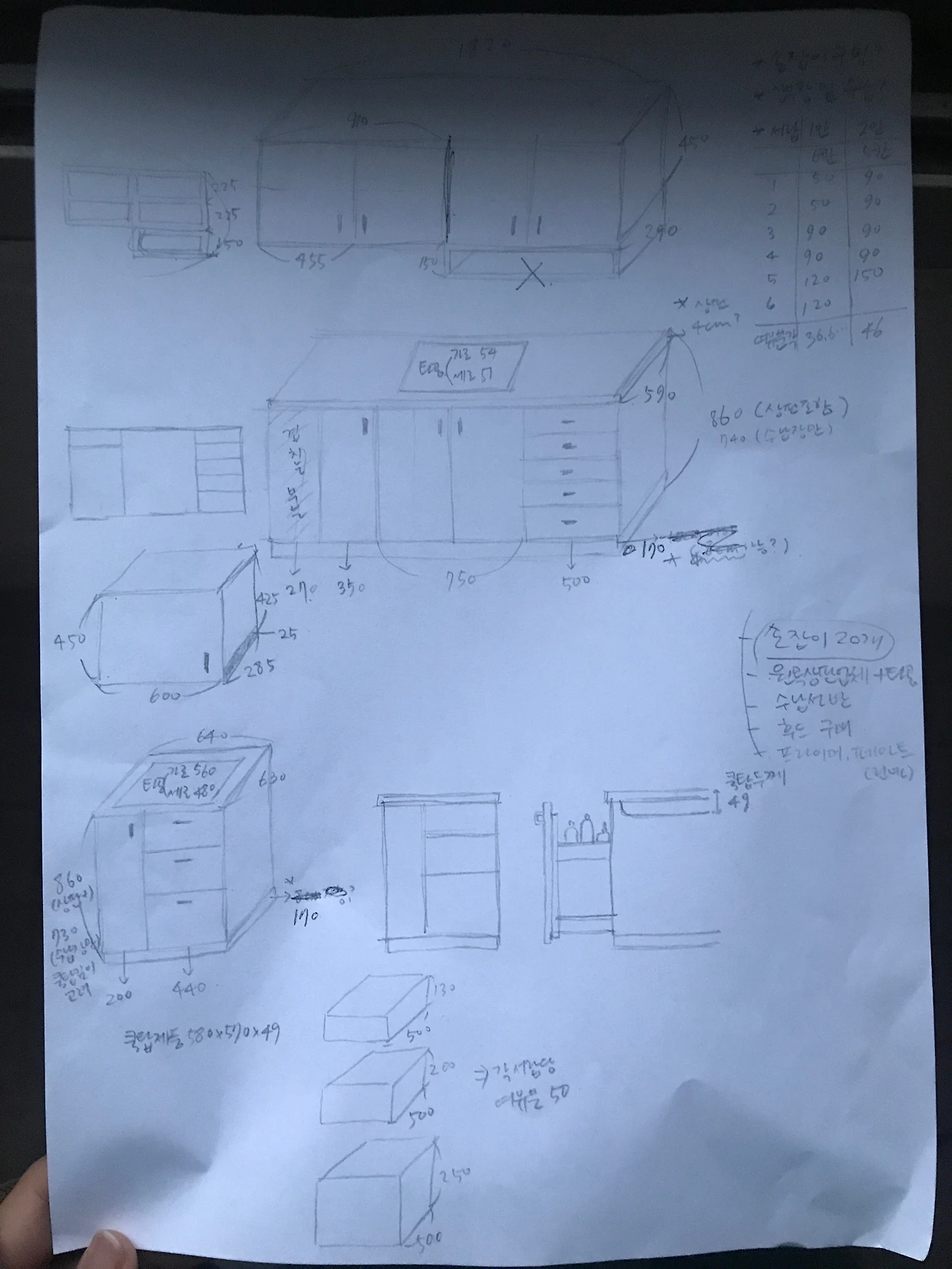 상하부장은 원하는 디자인으로 직접 도면을 그린 후 싱크대 시공 업체를 수소문했다. 사실 업체에 시공을 맡기면 표준 규격으로 나와있는 기성품을 부엌 크기에 맞춰 설치해 주는 것으로 간단하게 끝이 난다. 하지만 우리는 서랍의 폭과 높이, 수납장의 길이, 재질 등 거의 모든 걸 표준에서 벗어나는 방식으로 요청했기 때문에 우리와 일하게 될 업체는 고생을 꽤나 하게 될 것이었다.