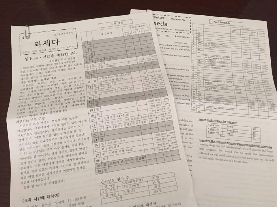 그런데 놀라운 일은 거기서 끝이 아니었다. 와세다 유치원에서는 한 달에 한 번씩 월별 일정표를 나누어 주었는데 신주쿠구에서 일본어에 익숙하지 않은 우리를 위해 그 일정표를 매달 영어와 한국어판으로 따로 제작해서 준비해 준 것이다! 며칠 전 이 글을 쓰기 위해 따로 모아두었던 그 일정표들을 꺼내서 읽고 있었는데 옆에서 남편이 이런 말을 건넸다.