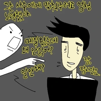 동기는 성실하고 착한 사람이었다. 항상 본인이 부족하다며 자책만 하다가 어느날 본인은 절대 사수에게 맞출수 없다는 것을 깨달았다.