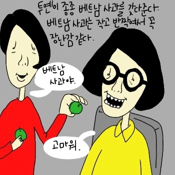 투옌이 사과에 벌레가 들어있는 이유는 사과가 맛있기 때문이라고 했다. 농약도 안쳤으려나