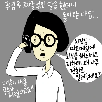 일하다 말고 전화를 받고 현지인과 확인 후 다시 전화를 드려서 답을 알려주는 메신저 역할에 지쳐서 왜 메일에 회신을 안 주시냐고, 메일로 일하는 게 업무의 기본 아니냐고 했더니 차장님이 본인이 영어를 못하셔서 메일을 못쓰신다고 했다.