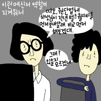 오늘 너무 짜증을 부려서 죄송한 마음이 들다가도, 그렇다고 내가 계속 메신저 역할을 해야 한다는 걸 생각하면.. 잘 모르겠다.