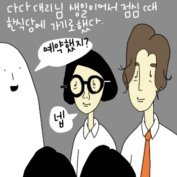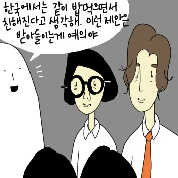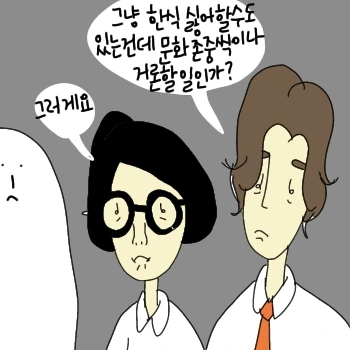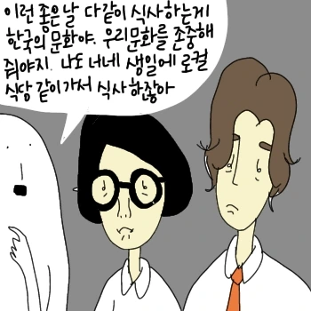 “부장님, 그 사람들은 한국 문화를 무시하겠다는 게 아니라 그냥 오늘 우리랑 같이 한식 먹으러 가는 게 불편하대요.”