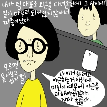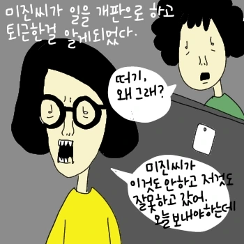 나는 외근 다녀와서 보고서를 작성하고 일을 해야 하는데 미진씨가 일을 똑바로 하고 가지 않아서 짜증이 났다. 그때 사실 미진씨 때문에 사고가 많이 나서 내가 수습을 하고 다니느라 예민했던 때라 미진씨의 책임감 없는 행동이 용서가 되지 않았다.