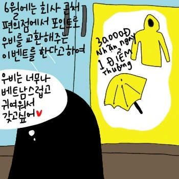 우리나라에서는 우비를 입을 일이 없고 입는 사람도 안 보이는 것 같은데, 베트남은 오토바이를 타는 사람들이 대부분이라 우비를 많이 판다. 그래서 비가 오면 사람들이 일제히 오토바이를 갓길에 세우고 우비를 입고 다시 오토바이를 탄다. 그래서 정말 갖고 싶었어... 편의점 로고가 박힌 노란 우비