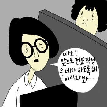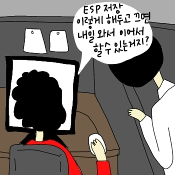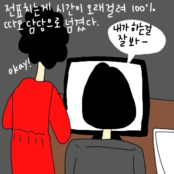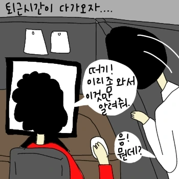 이런 그림 그리면 꼰대라고 댓글 달릴 것 같은데 욕하자는 건 아니고 신기해서 그려봄-오분만 더 일하면 홀가분하게 집에 갈 수 있는데 굳이 하던 일을 멈추고, 어떻게 저장하는지를 배우고 퇴근하려는 그녀의 태도 정말 대단해