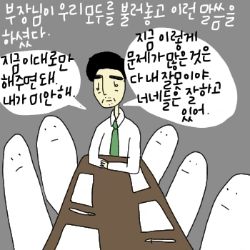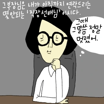 내가 업계에서 만난 사람 중에 제일 존경하는 사람은 그림 속의 부장님이다. 어떤 생각으로 일을 해야 하는지를 제일 잘 알려 주셨고 가르침도 많이 받았다. 혼나기도 많이 혼났는데 좋은 기억만 남아있다. 베트남 오기 전에는 남자 옷 샘플을 받게 되면 꼭 부장님께 택배로 보내드렸고, 작년에는 부장님이 베트남에 출장 오셔서 따로 만나기도 했다. 나도 부장님처럼 좋은 사수가 될 수 있을까 항상 고민한다.