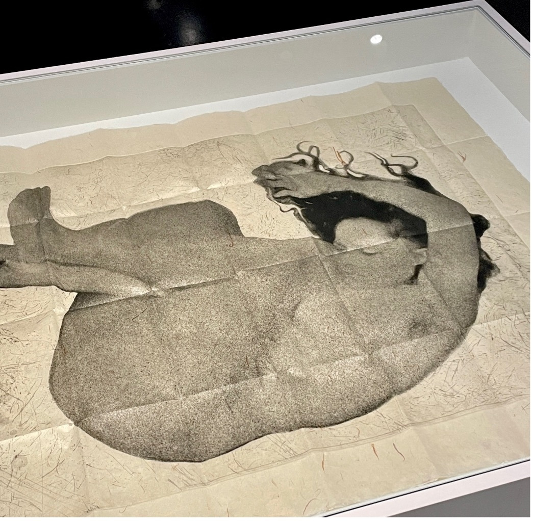 암사슴으로부터 여성이 태어나는 장면을 묘사한 작품 <탄생>을 보자마자 그리스 로마 신화의 아르테미스 여신을 떠올릴 수밖에 없었다. 사슴은 동물들과 교감하는 힘을 갖고 있는 아르테미스를 상징할 뿐만 아니라, 많은 아메리카 원주민 문화의 토테미즘적 신화에서도 신성시되는 동물이지 않은가. 작은 암사슴이 성인 여성에게 생명을 부여하는 장면을 묘사한 작품은 마치 키키 스미스가 인간이 자연을 파괴한다면 결국 우리 역시 존재하지 않게 될 것이라고 경고하는 것만 같았다. 종교와 신화 속 모티프를 차용한 작품을 감상하며 수직과 수평의 형태로 뿜어져 나오는 탄생의 에너지를 느낄 수 있었다. 또한 늑대의 배를 가르고 걸어나오는 여성의 모습을 담은 작품인 <황홀> 역시 관람객이 직접 이야기를 상상하게 만드는데, 사냥꾼이 늑대의 배를 갈라 살려냈던 할머니와 빨간 망토의 우화를 비틀어 직접 늑대의 배를 찢고 나오는 당당한 성인 여성의 모습을 표현하고 이에 황홀rapture이라는 이름을 붙인 것이 인상적이었다. 동판화, 블루프린트 연작과 종이를 이용한 조각 작품 역시 똑같은 빨간 망토 동화를 모티프로 한 작품들이었는데, 동일한 모티프를 활용했더라도 각각의 작품을 바라볼 때마다 다른 이야기를 상상하게 되는 경험을 할 수 있었다.