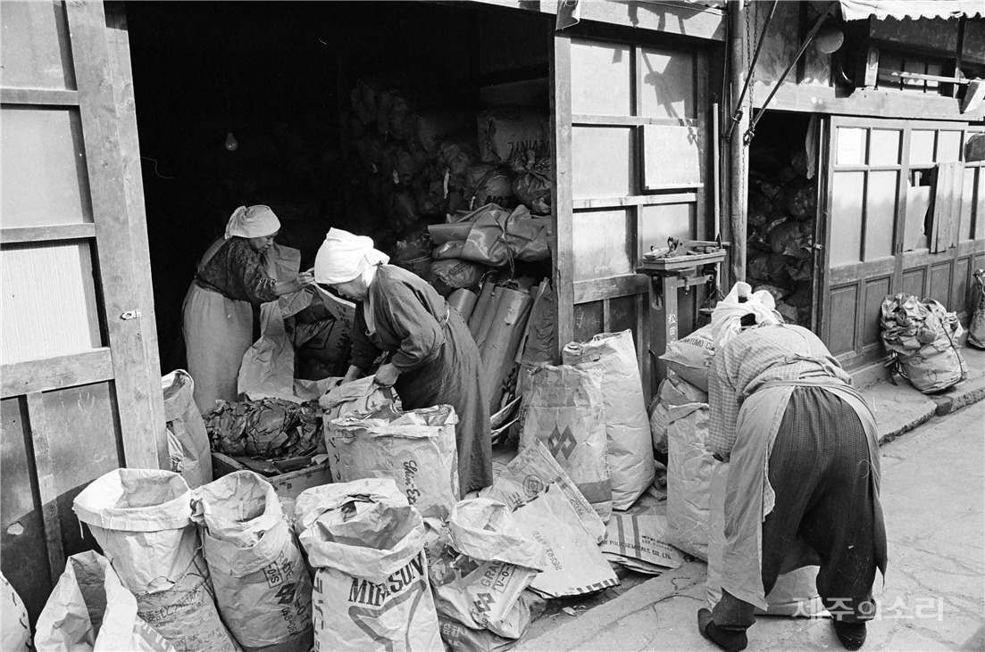 ‘이카이노’에 조선인 집창촌이 만들어지자 자연스럽게 조선 시장이 생겼습니다. 예로부터 생활력이 강한 제주 여성들은 생계를 위해 무허가 좌판을 펼치고 직접 채취한 전복, 미역 등의 해산물, 김치, 된장, 생활용품 등을 팔았습니다.
