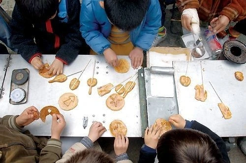 국자 속에 빠진 아이들의 눈빛이 설탕과 함께 녹는다