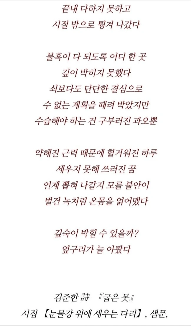 김준한은 "별을 가진 사람들은 중력에 수긍하며 산다/그래서 한 사람이 한 사람에 닿으려면/별과 별 사이에 드리운 허방을 건너야(우주를 건너는 일)" 하는 것을 아는 시적 내공이 만만치 않은 천상 시인이다. 하지만 오랫동안 나에게는 '종기' 같은 존재였다. 귀찮고 아프고 내 삶에서 제발 사라져주길 바랐던. 이 글을 읽으면 그는 섭섭해하기는커녕 씩 웃고 말 것이다. 그의 첫 시집에 실린 시다.
