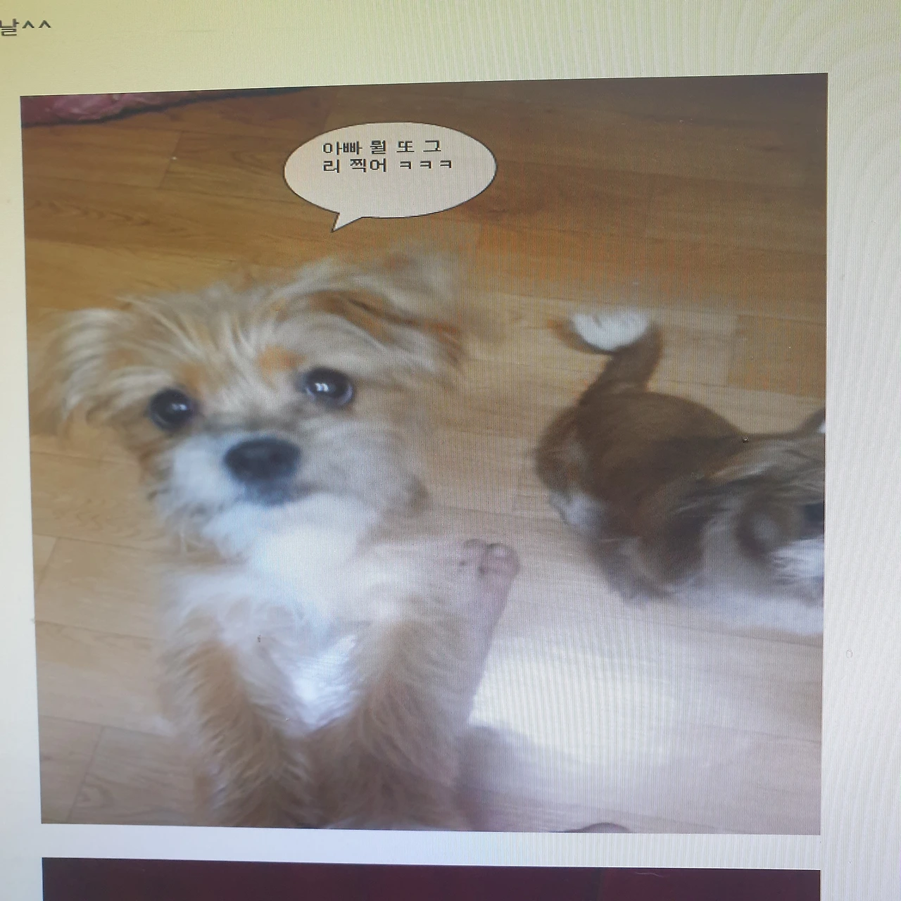 아빠가 다시 오빠를 혼 내키자 세상에나, 다롱 오빠도 방금 전 저처럼 납작 엎드린 자세로 아빠의 가슴을 파고들었어요.
