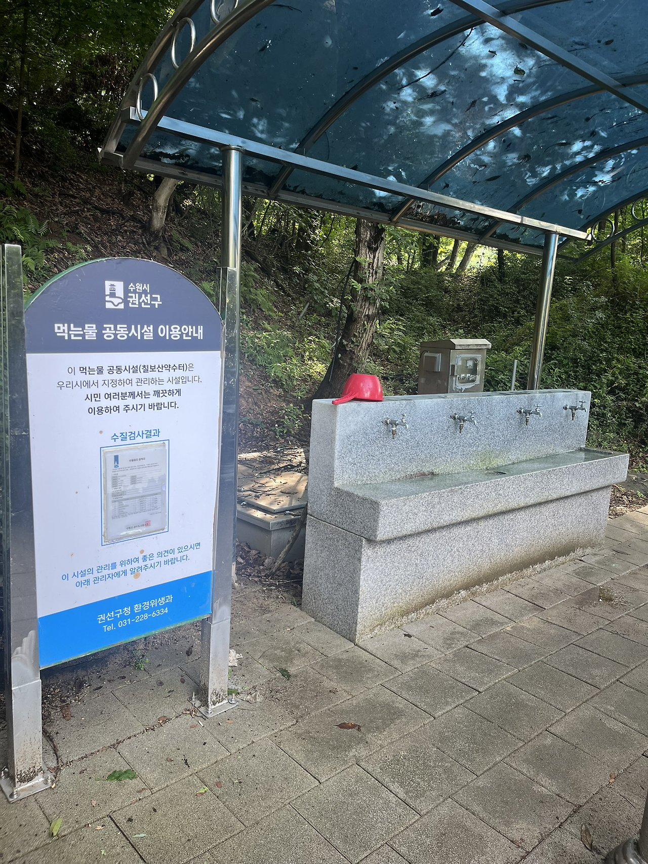 이어서 내리막이 계속된다. 올라올 때가 걱정된다. 드디어 약수터가 보인다. 시원하게 약수를 마신다.