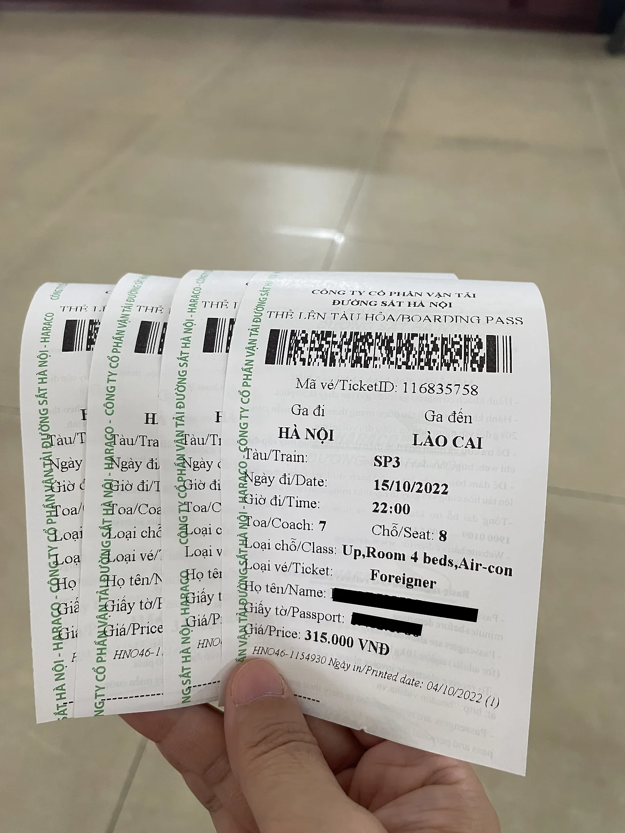 거의 7시간을 가야 하는 거리이기에 밤 10시 출발 기차로 침대칸을 예매했다. 윗자리는 315,000동 아랫자리는 330,000동으로 가격차이가 있고 조금 업그레이드된 객실은 비용이 더 비싸다고 했다.