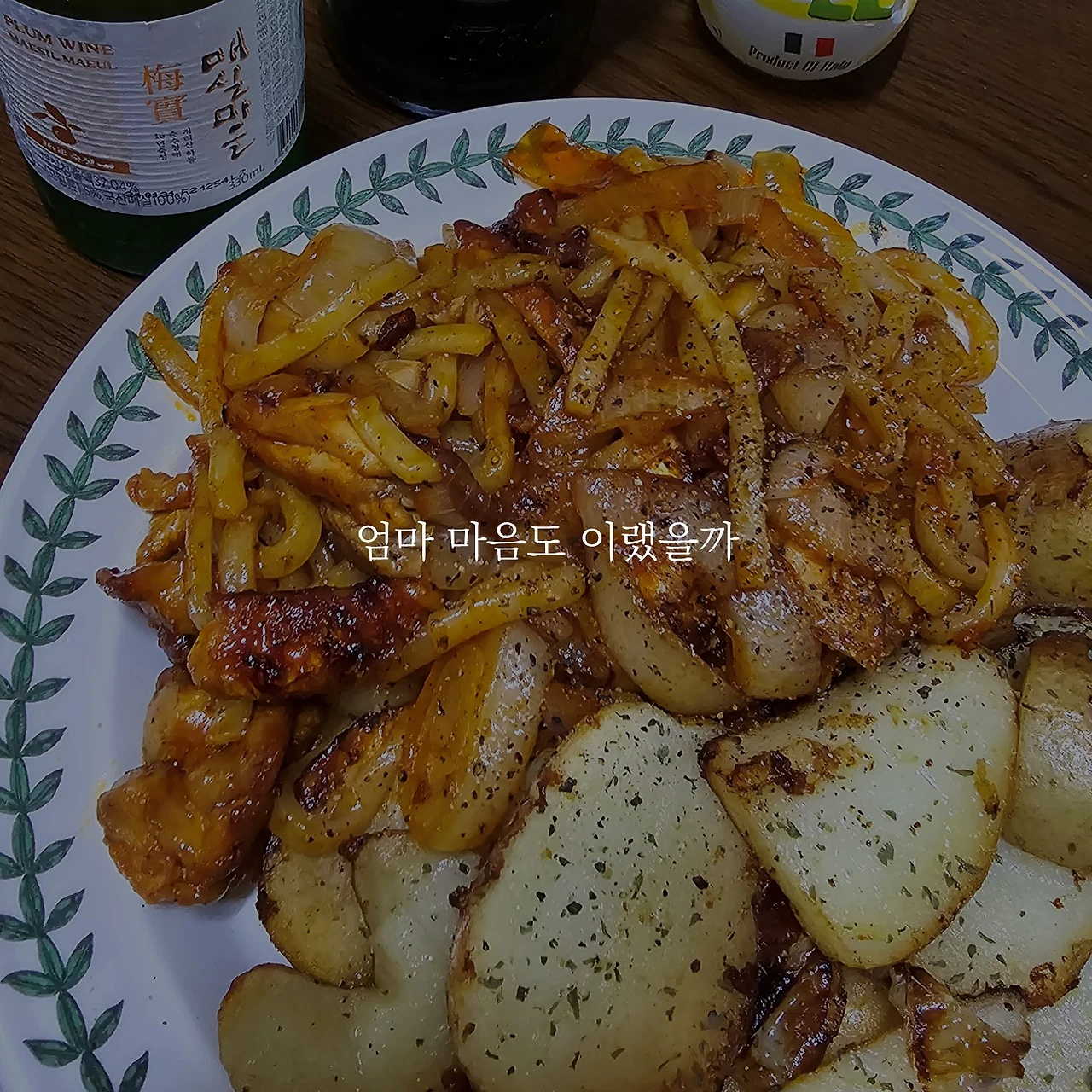 그래서 닭다리살을 굽고, 그 기름에 감자를 굽고