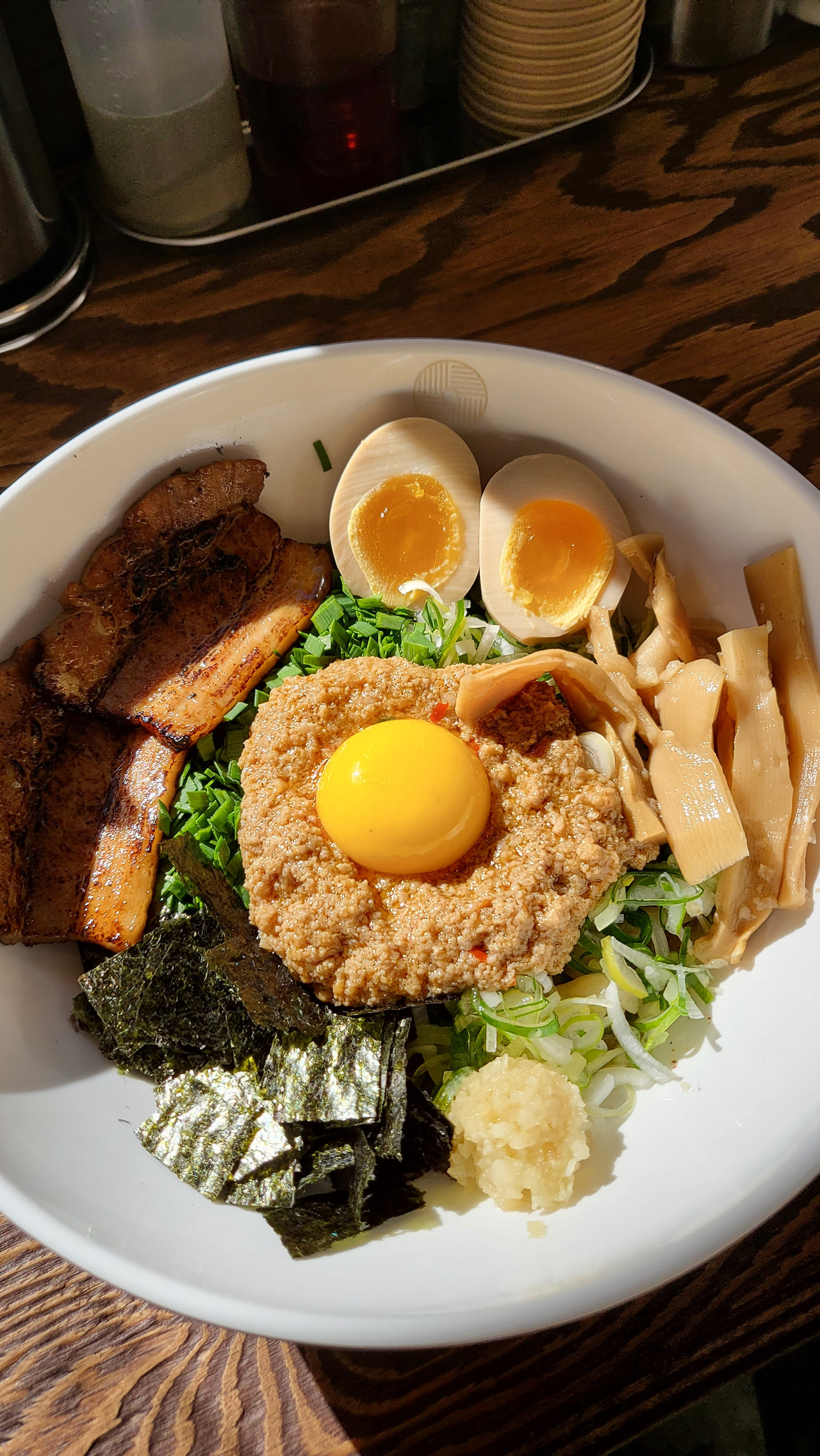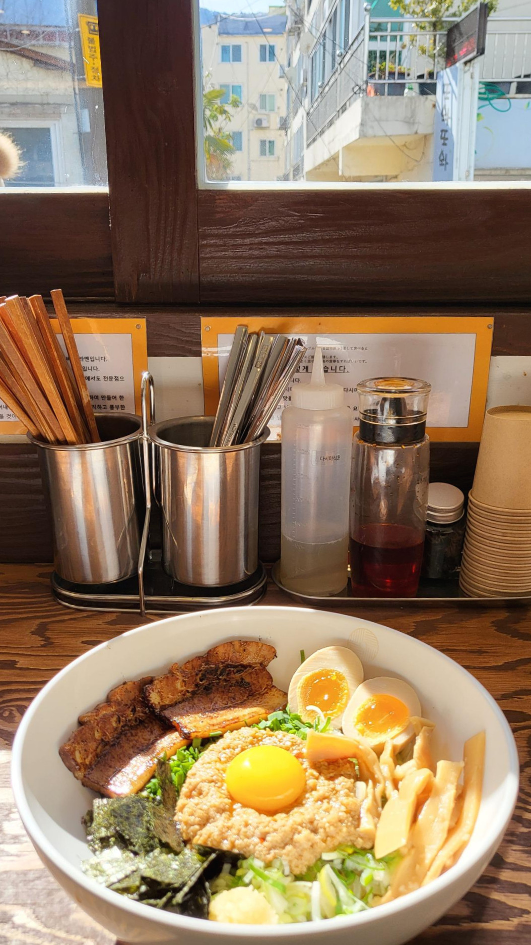 뭍으로 돌아와 바지락라멘을 선택하면서 못 갔던 다른 식당으로 향했다. 마제 소바를 처음으로 먹어보기 위함이었다. 자그마한 식당이었지만 점심때보다 조금 늦은 시간이어서 다행히 자리가 많았다. 키오스크로 주문을 하는데 토핑(온센다마고와 차슈, 죽순)이 보였고 본연의 맛을 해치지 않으리란 판단에 모두 추가했다. 창밖으로 보이는 털모자 방울이 귀엽다고 생각할 즈음 요리가 나왔다.