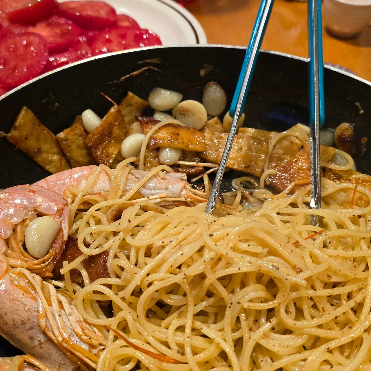 새우와 마늘을 볶아 스파게티를 만들었다