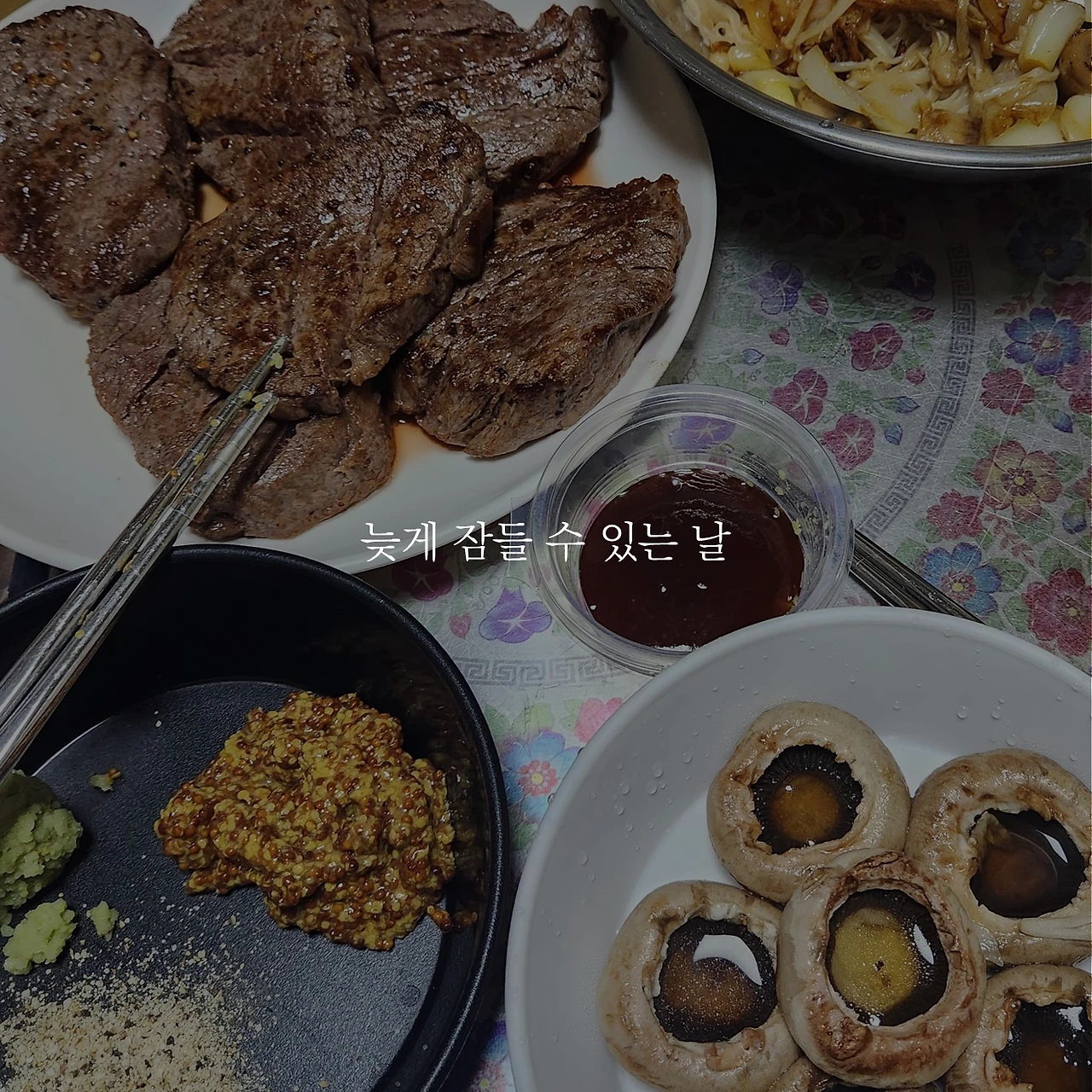 비를 뚫고 사 온 안심 잘 굽고, 물러가던 양파와 버섯도 마저 노릇하게
