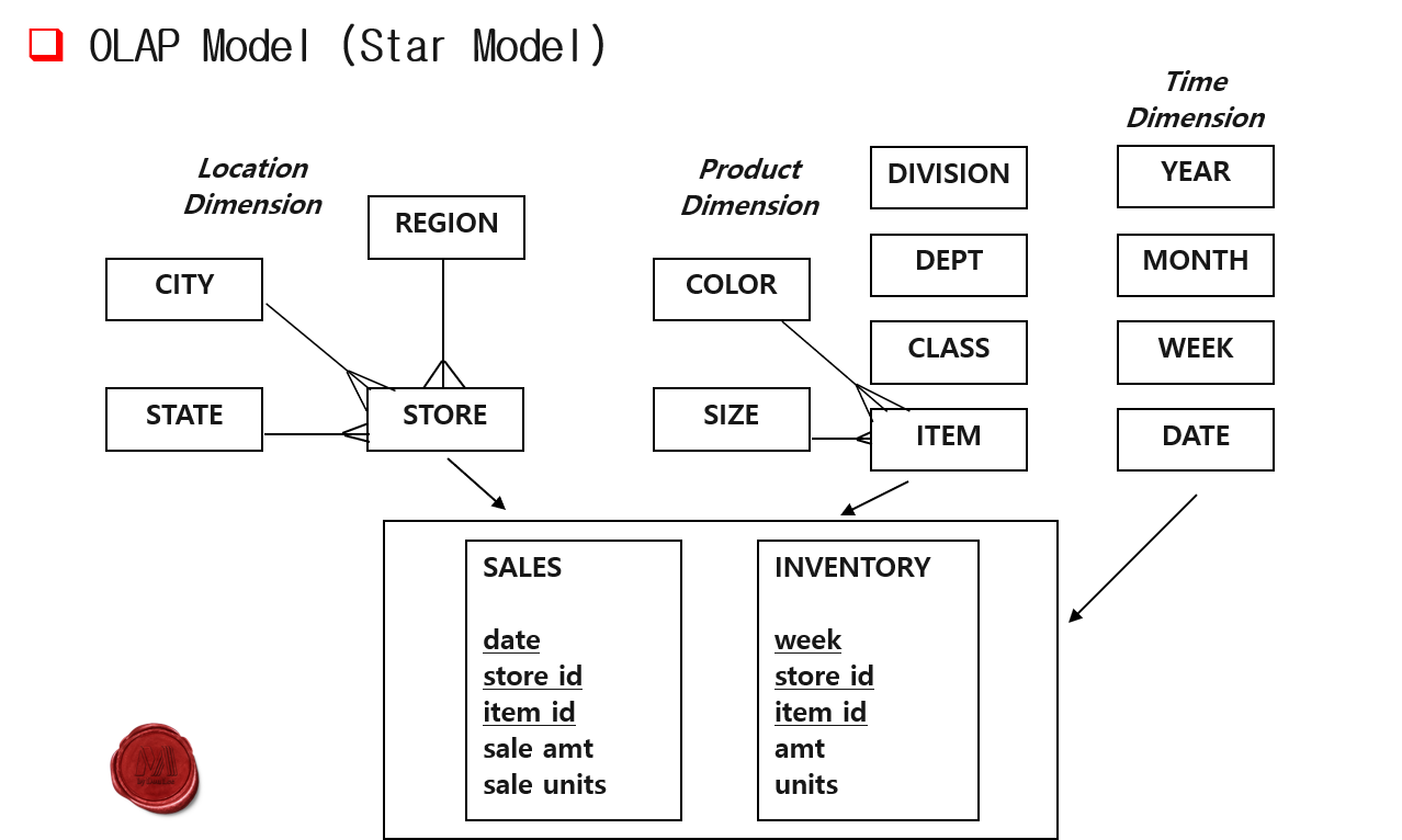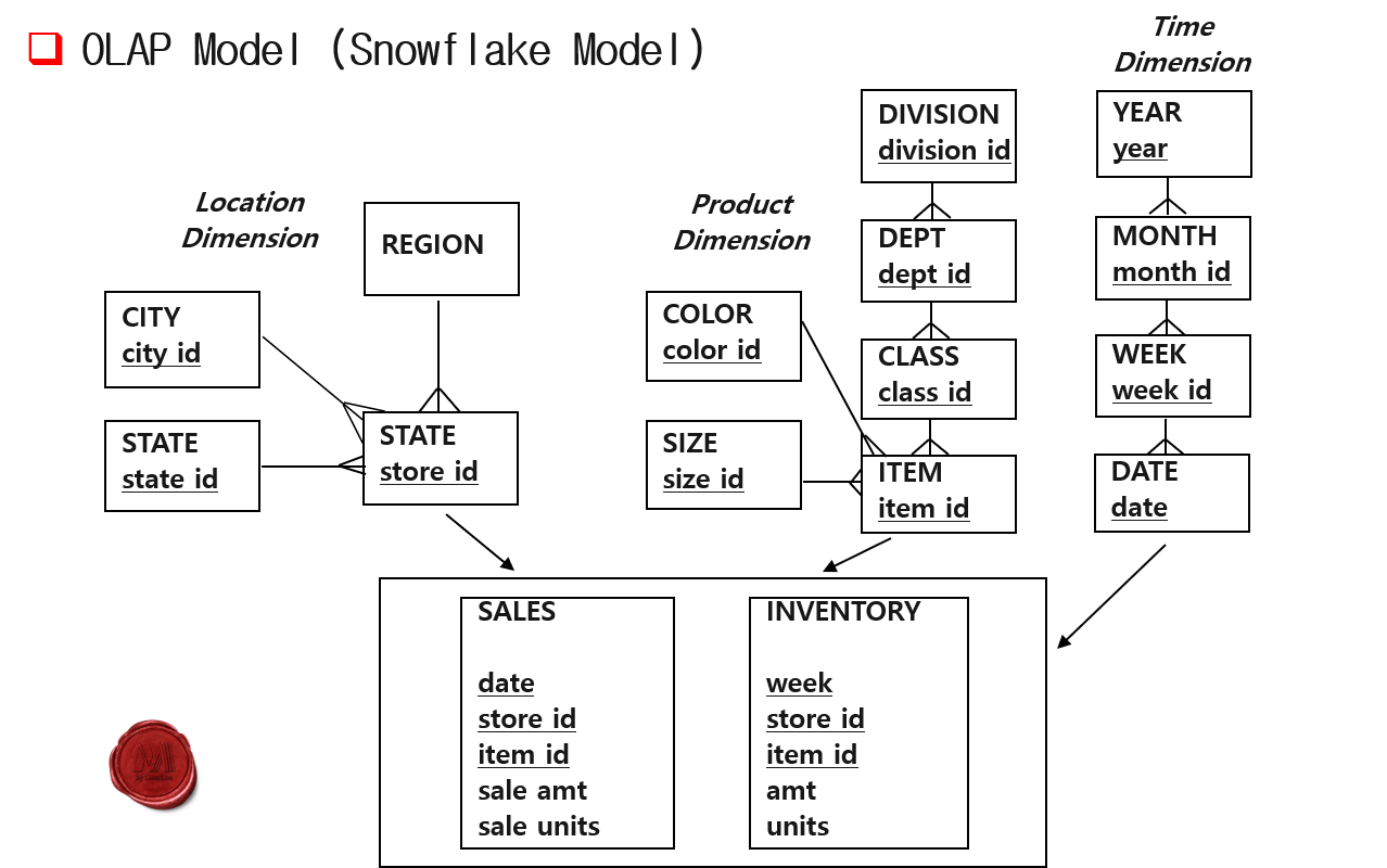 기업용 데이터베이스는 관계형 데이터베이스에서도 기간계 데이터베이스(On-Line transaction processing, 이하 OLTP)와 분석계 데이터베이스(On-Line Analytical Processing, 이하 OLAP)로 구분하기도 합니다. 기간계 데이터베이스는 ERP, 쇼핑몰, SCM 등 업무 처리를 위한 데이터를 관리하는 시스템을 말합니다. 분석계는 기간계 시스템의 데이터를 분석계로 가지고 와서 비즈니스적으로 의미 있는 내용을 찾아내는 형태로 사용합니다. 기간계 시스템은 데이터의 추가/수정/삭제의 속도를 더 중시하는 형태로 데이터 모델이 만들어지고 분석계는 대량의 데이터를 빨리 읽을 수 있는 구조인 Star 또는 Snowflake 모델로 데이터 구조를 구성합니다.
