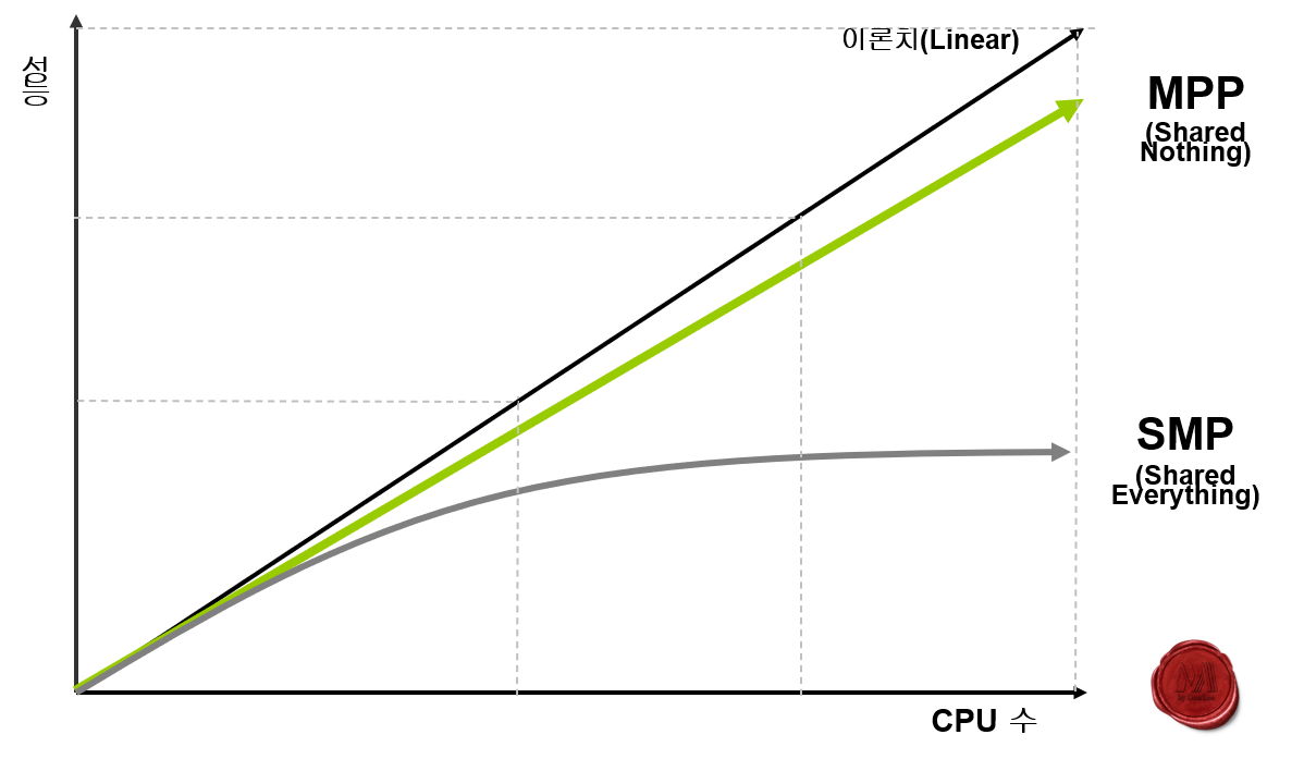 OLAP는 데이터웨어하우스(Data Warehouse, 이하 DW)를 구성하기 위해 일반적인 관계형 데이터베이스(대칭형 다중 처리, Symmetric Multiprocessor, 이하 SMP)와 병렬 처리 데이터베이스(초병렬 처리, Massively Parallel Processor, 이하 MPP)로 구분하여 이야기할 수 있습니다.