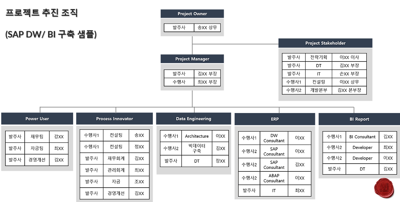 프로젝트의 주인은 발주사(고객)입니다. 프로젝트를 수행사에게만 맡기는 건 소중한 프로젝트 예산을 버리는 것과 같습니다. 프로젝트팀 구성할 때 발주사에는 PM만 나오고 수행사로만 조직하는 경우가 있는데 가장 위험한 프로젝트 조직 구조 입니다. 성공적인 프로젝트를 위해서는 발주사에서도 향후 사용하는 유져와 구축 운영하는 조직이 프로젝트에 같이 참여할 때 프로젝트의 성공 확률이 높아집니다. 업무 영역의 인력과 IT/DT 인력에서 유지 보수 할 수 있는 인력이 같이 참여하는 것이 향후 프로젝트 종료 후 안정적으로 운영할 수 있는 방법입니다.