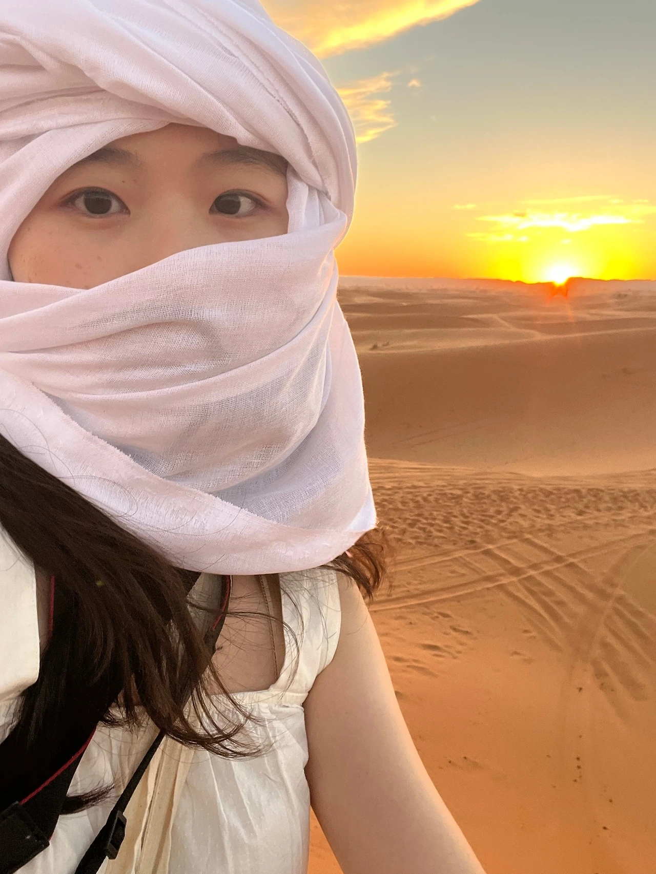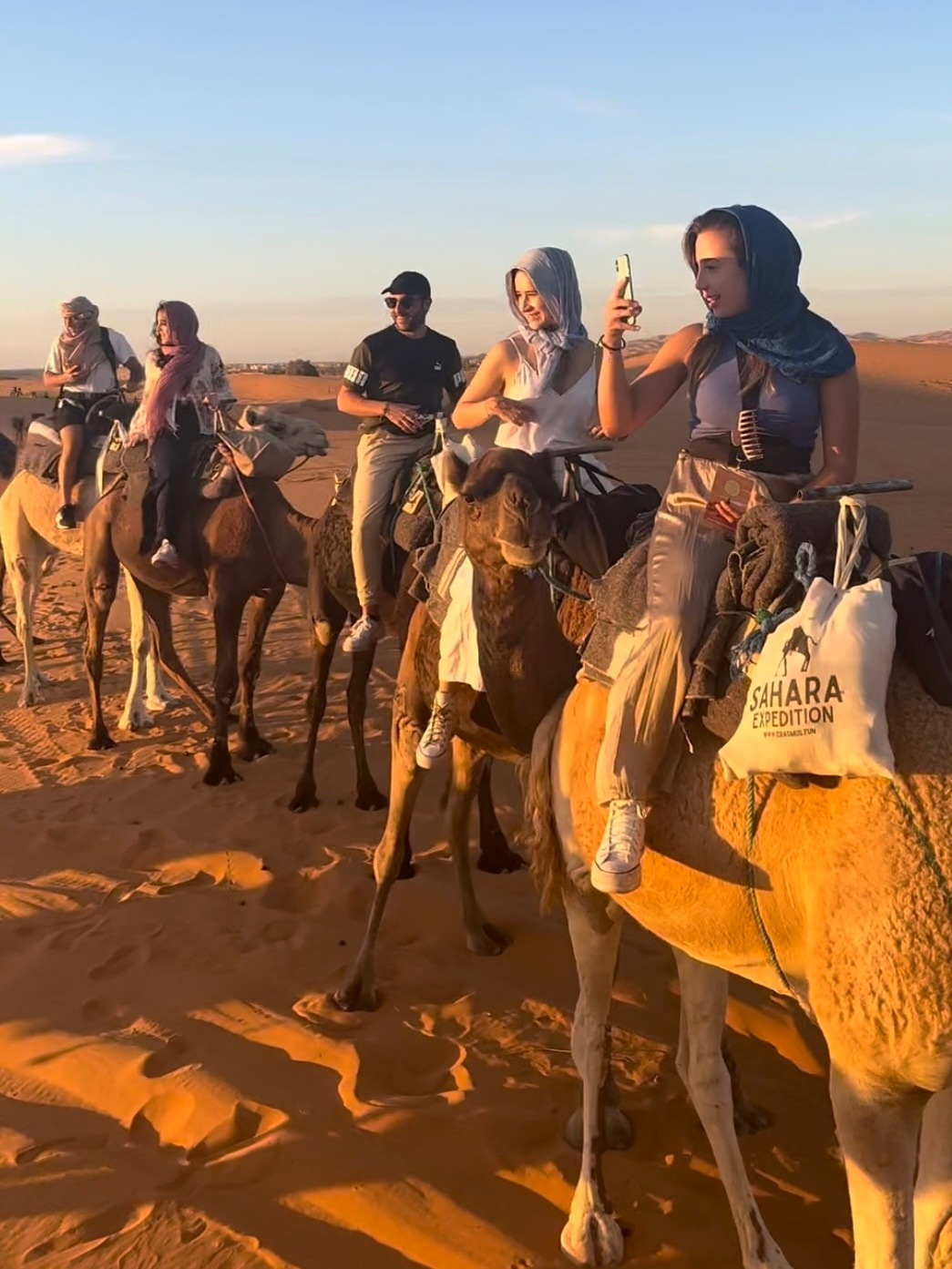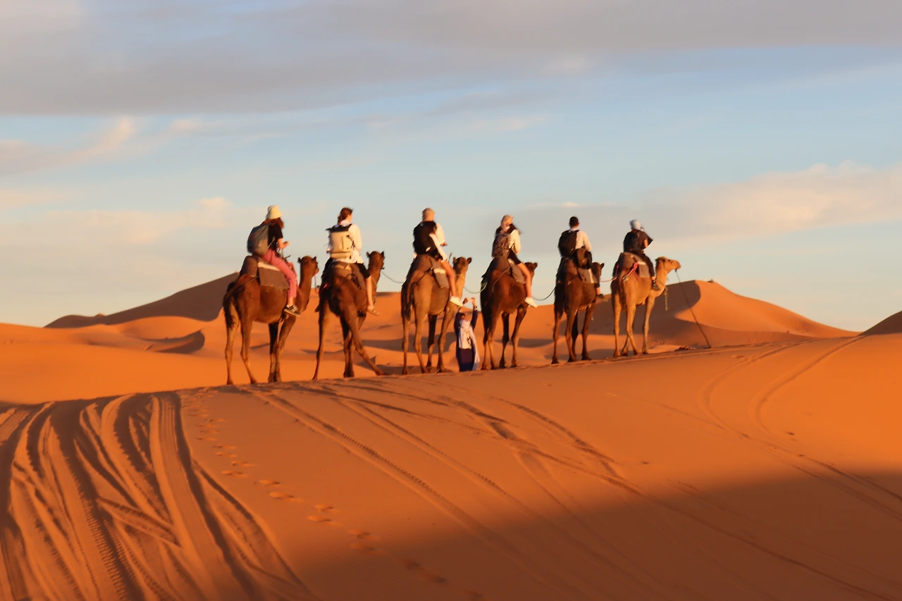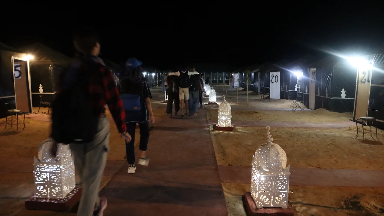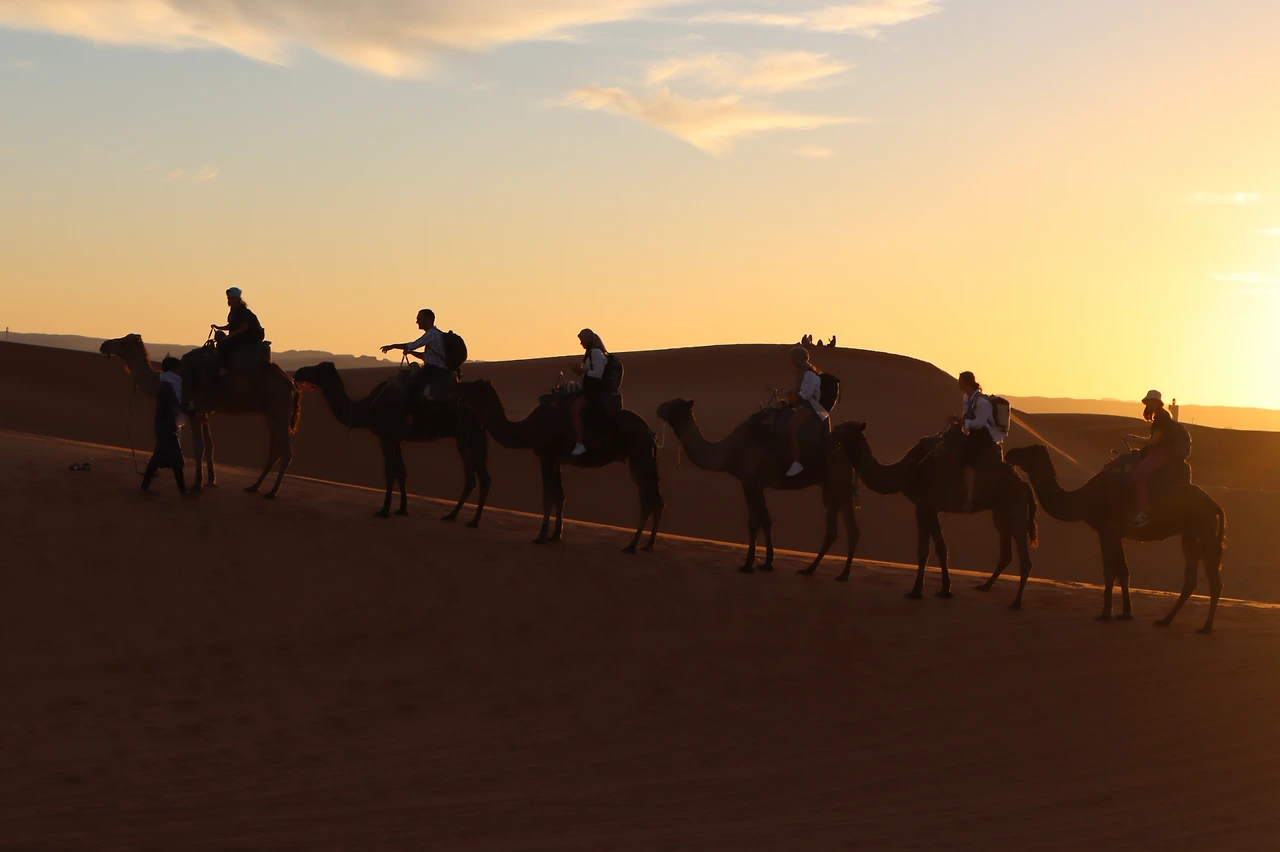 본격적으로 사막을 횡단하기에 앞서 일전에 전통 의상점에서 산 히잡을 주섬주섬 꺼냈다. 천을 마구잡이로 얼굴에 두르고 있었더니 보다 못한 베르베르인이 다가와 도와주었다. 우리가 탈 낙타를 관리하는 청년이었다. 그의 안내에 따라 낙타에 올라탔다. 웅크리고 있던 낙타는 몸을 앞으로 기울이고 긴 다리를 펼쳐 보이며 일어섰다. 순간 무게가 앞쪽으로 쏠리는 바람에 고꾸라지지 않게 두 다리로 낙타의 몸을 끌어안아야 했다. 친구들도 잇따라 외마디 비명을 지르며 낙타에 몸을 실었다. (나는 당시 74명의 외국인 친구들과 함께 모로코를 여행하고 있었다.) 메고 있던 작은 가방에는 사막에서 하룻밤을 보내는 동안 필요한 최소한의 짐이 들어있었다. 물을 두둑이 챙기는 것도 잊지 않았다. 2L짜리 물병의 헤드 부분이 에코백 밖으로 삐죽 튀어나와 있었다. 우리는 낙타를 타고 사막 깊숙한 곳으로 들어가 그곳에 마련된 베이스캠프에서 밤을 보낼 예정이었다.